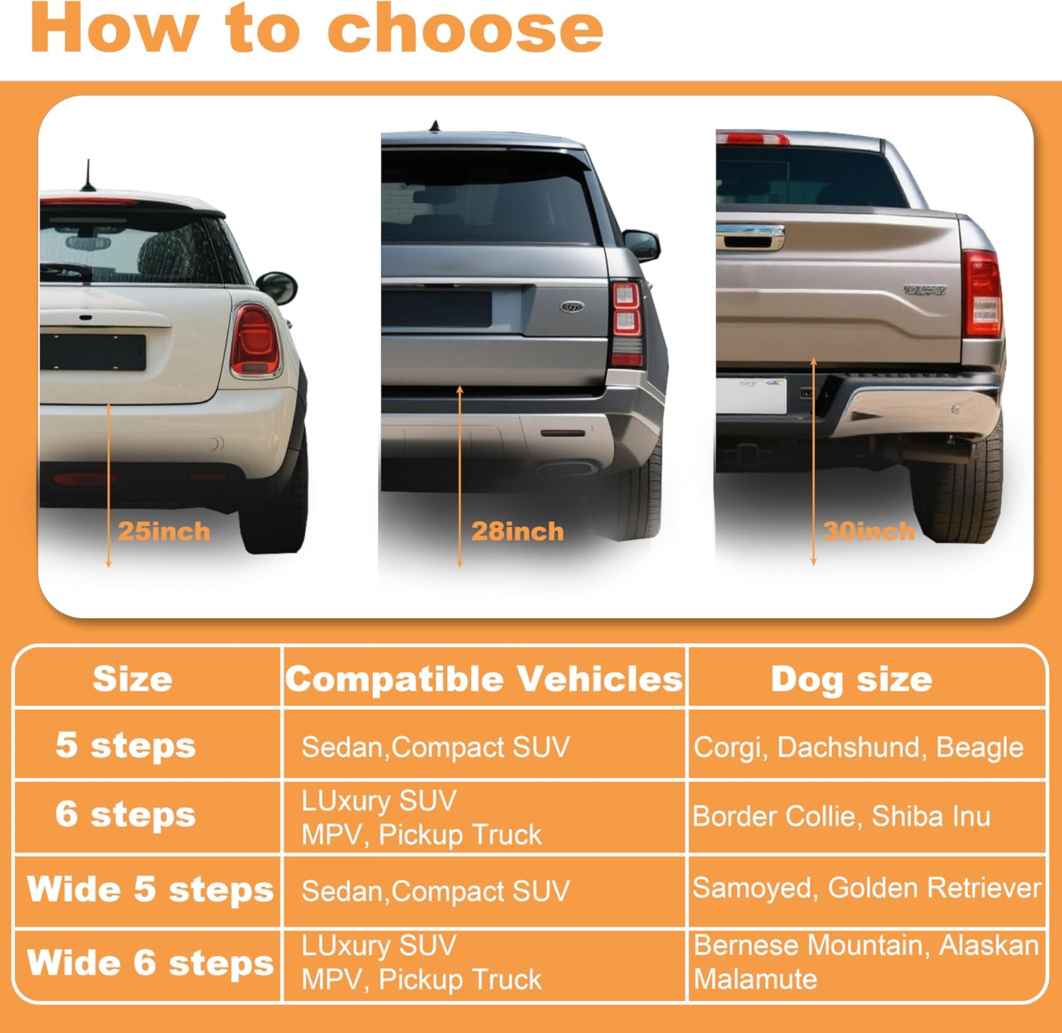 For vehicles with a trunk height under 23 inches, you can use the 5-step ramp, but the 6-step ramp offers a gentler incline for more comfort. For trunk heights between 23 and 30 inches, the 6-step ramp is recommended.