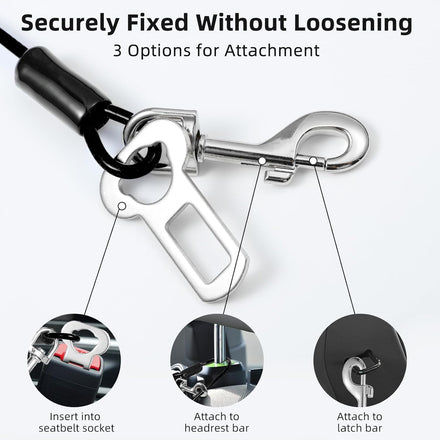 - Multiple Fixing Methods: The dog seat belt is equipped with 2 buckles and a latch, which can either be easily attached to the car headrest bar or directly inserted into the seat belt socket for flexible use in the front seat, back seat or boot. Another buckle attaches to the pet's chest strap to ensure the pet is secured to the seat.