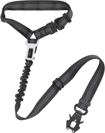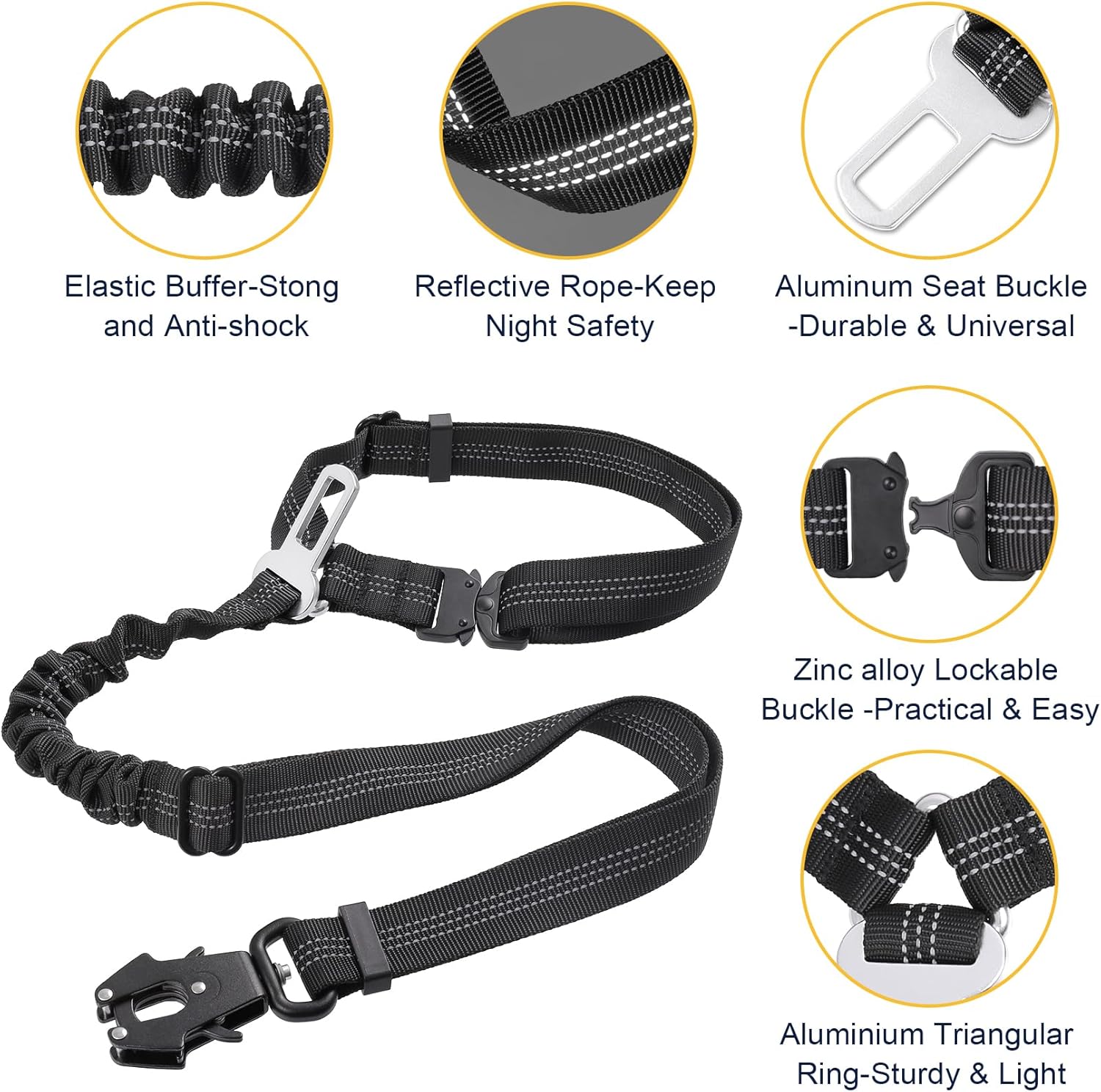 - ELASTIC BUFFER DESIGN. Dog car harness have elastic buffer to keep your dog safe from the risk of choking when the car brakes suddenly or takes a sharp turn. Adjustable dog seat belt from 60cm to 73cm allows your dog to sit, stand or lay down comfortably and enjoy the scenery along the way while keeping him safe in the car. Allow your pet to move freely in a certain amount of space without a sense of strict control