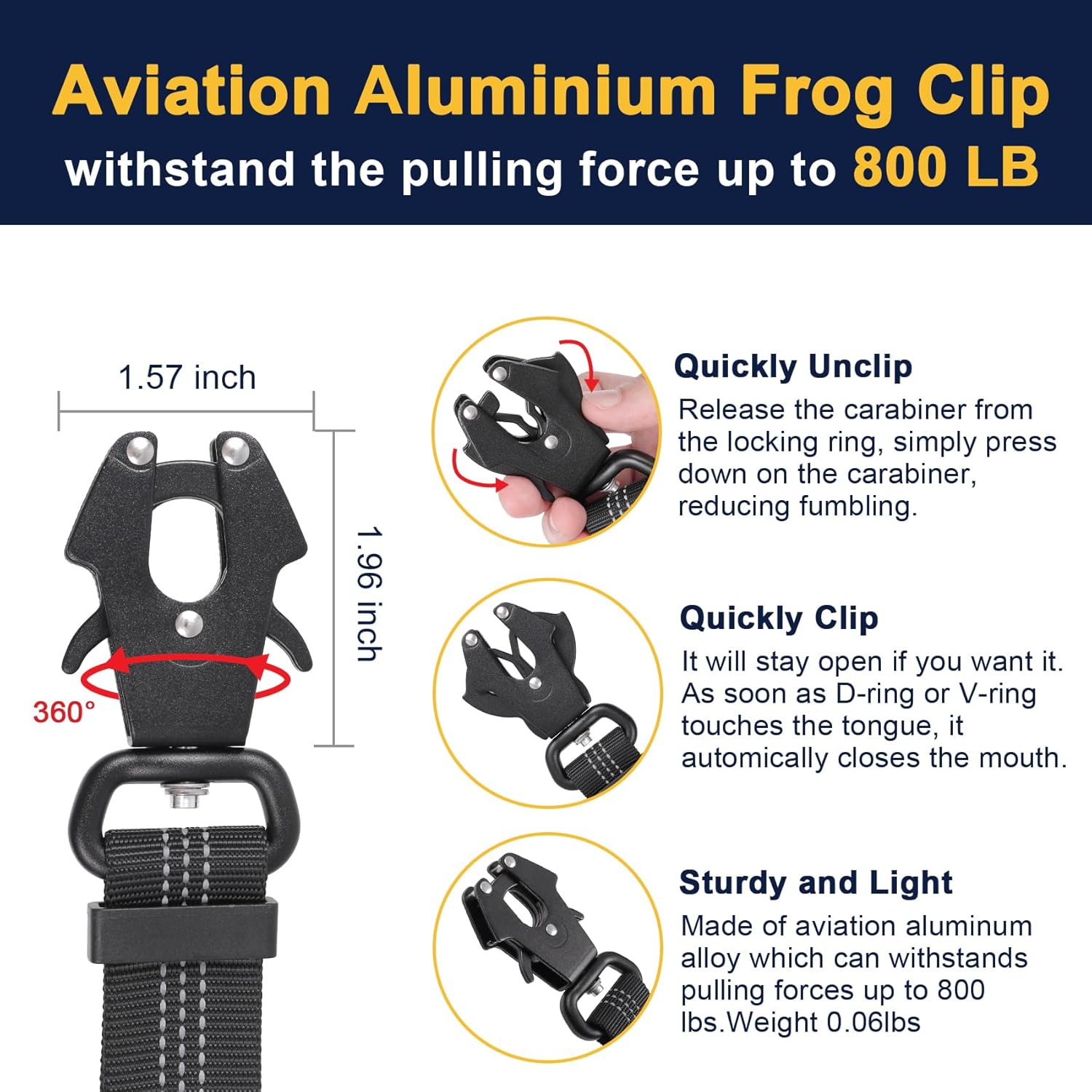 - UPGRADE HEAVY DUTY AUTO LOCK HOOK. Dog seat belt is fitted with a durable automatic closure Frog Clip which is made of aviation aluminum. It is not only releases and locks quickly, but also withstands pulling forces up to 800 lbs. Just touch the D-ring or V-ring, it will be automatically fastened in a few seconds without accidentally opening. Compared to traditional dog clips, you'll be able to far easily clip and unclip with one hand