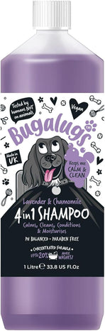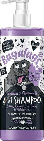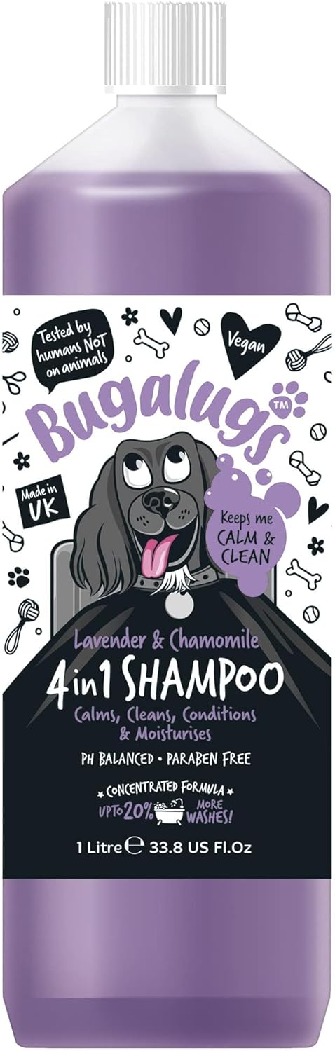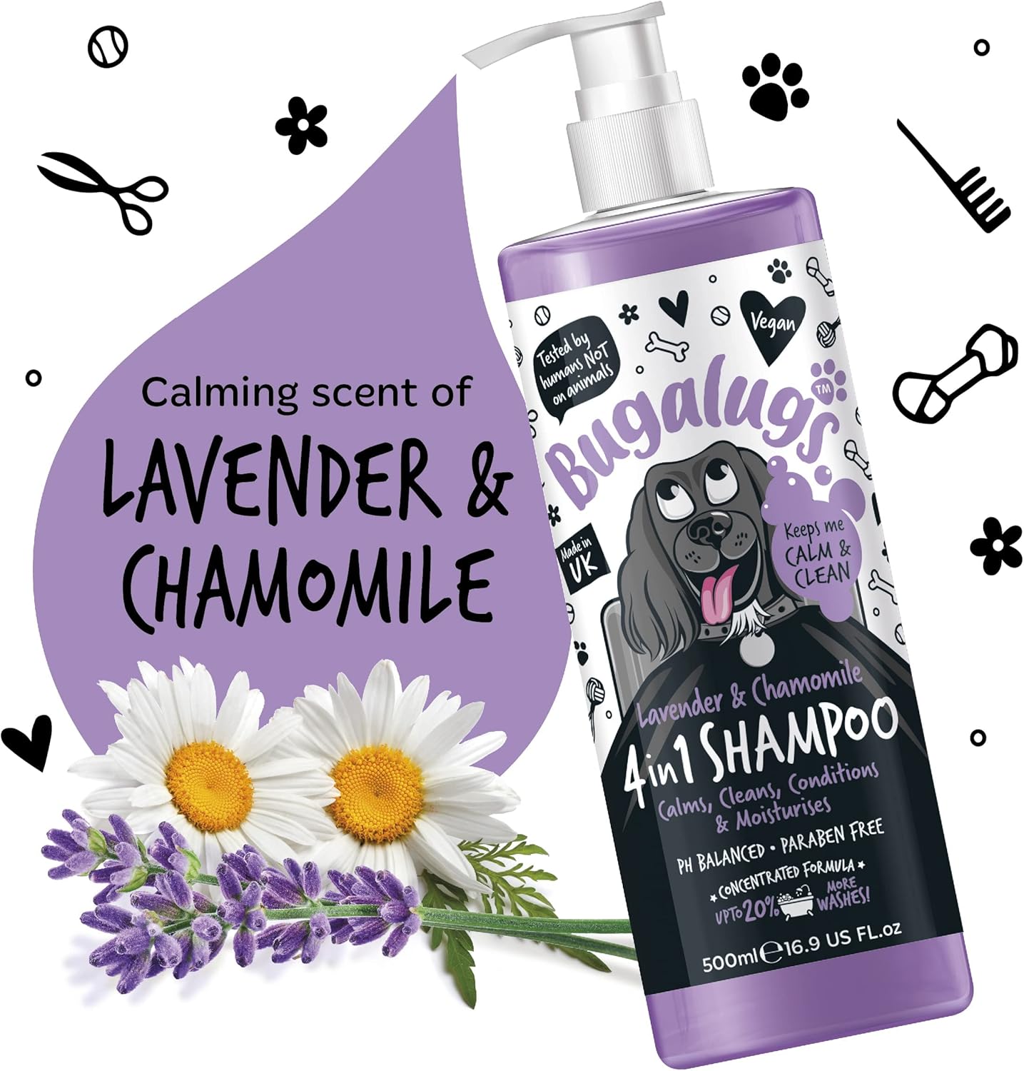 A gentle PH balanced 4 in 1 dog shampoo that calms, cleans, conditions, and moisturises. Gentle cleansing pet shampoo for dogs with a calming scent. It is perfect for removing puppy and doggy odours. Dog wash cleanses deeply yet will not irritate the skin, leaving the coat clean, plush and smelling irresistible! puppy shampoo and conditioner formula is vegan and helps soothe and nourish the coats sensitives skin. This rich lathering shampoo's is packed with lavender and chamomile essential oils which help to soothe irritated skin and calm anxious dogs. This has made this dog grooming products a favourite shampoo in salons and homes all around the world! Suitable for puppies over 8 weeks. Suitable for all coat types. Dog grooming shampoo professional is made in the uk with water from the Lake District, England and is a great puppy shampoo for sensitive skin. Dogs shampoo removes dirt and grease, leaving the coat feeling soft and shiny, Dog shampoo for puppies Can be diluted at ration of 10:1.