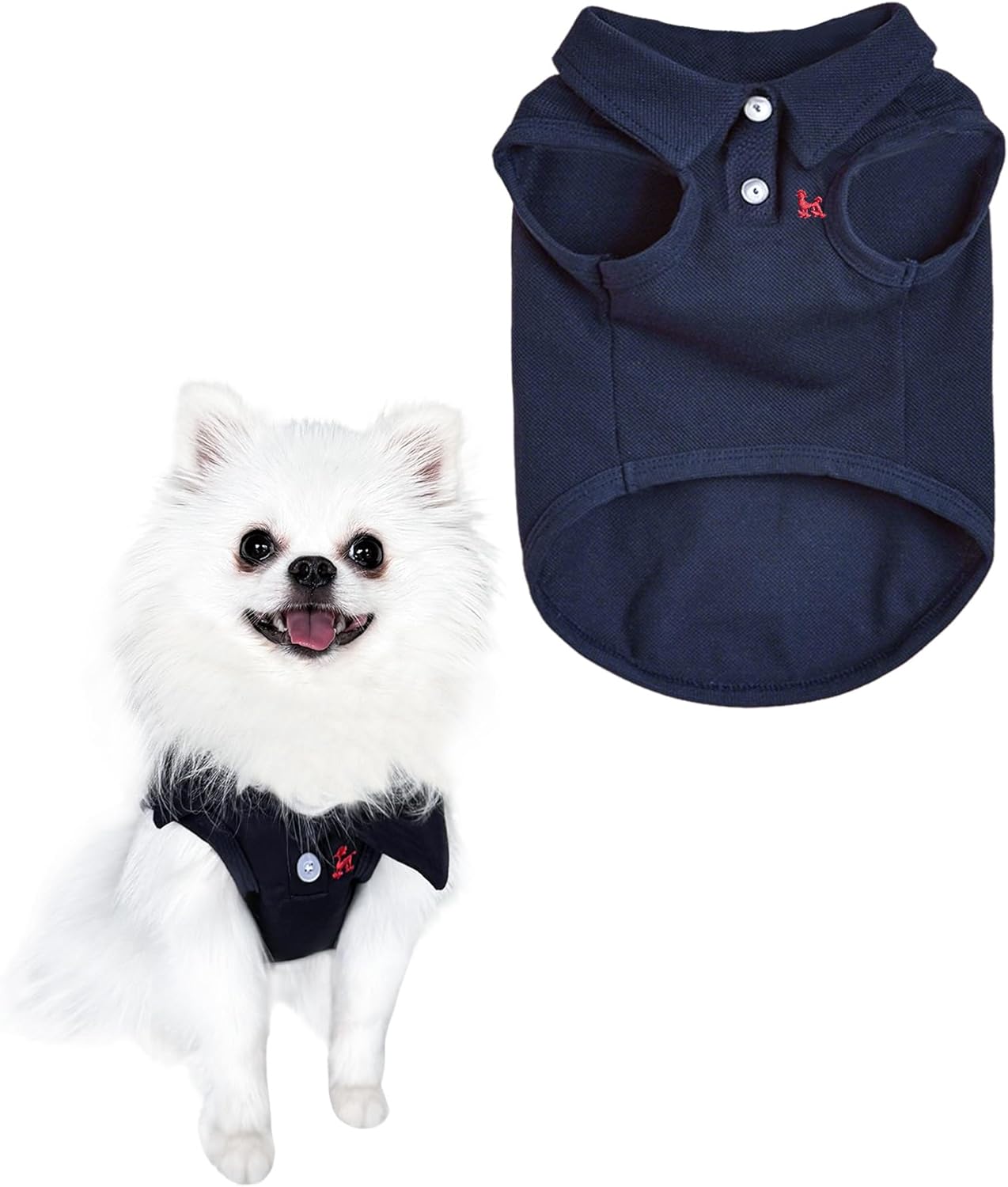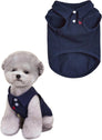 - Classic Navy Polo with Red Embroidery: This stylish dog shirt features a timeless navy blue polo design with crisp white buttons and collar for a polished look. The adorable red puppy embroidery on the chest adds a charming, playful touch that makes your pet stand out.