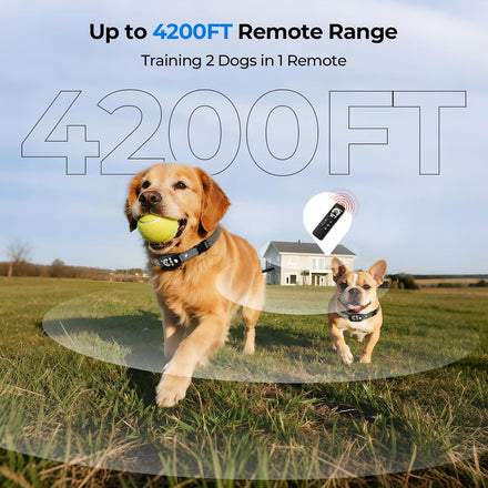- 2 Channels & Up to 4200FT:Our Dog Training Collar features an impressive 4200FT remote range, giving you full control even in wide open spaces like parks, farms, or backyards. With a dual-channel design, a single remote can easily switch between two collars-perfect for training two dogs simultaneously with one hand.