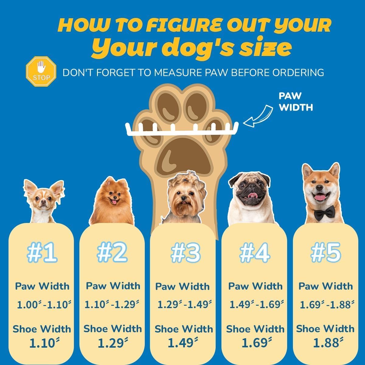 Choosing the right size dog boots for your puppy: Please refer to the picture size chart, choose the right size for your puppy. Size 1: Width 1.10 inch for 2.2-6.6 lbs; Size 2: Width 1.29 inch for 6.6-11.0 lbs; Size 3: Width 1.49 inch for 11.0-16.5 lbs; Size 4: Width 1.69 inch for 16.5-22.0 lbs; Size 5: Width 1.88 inch for 22.0-27.6 lbs