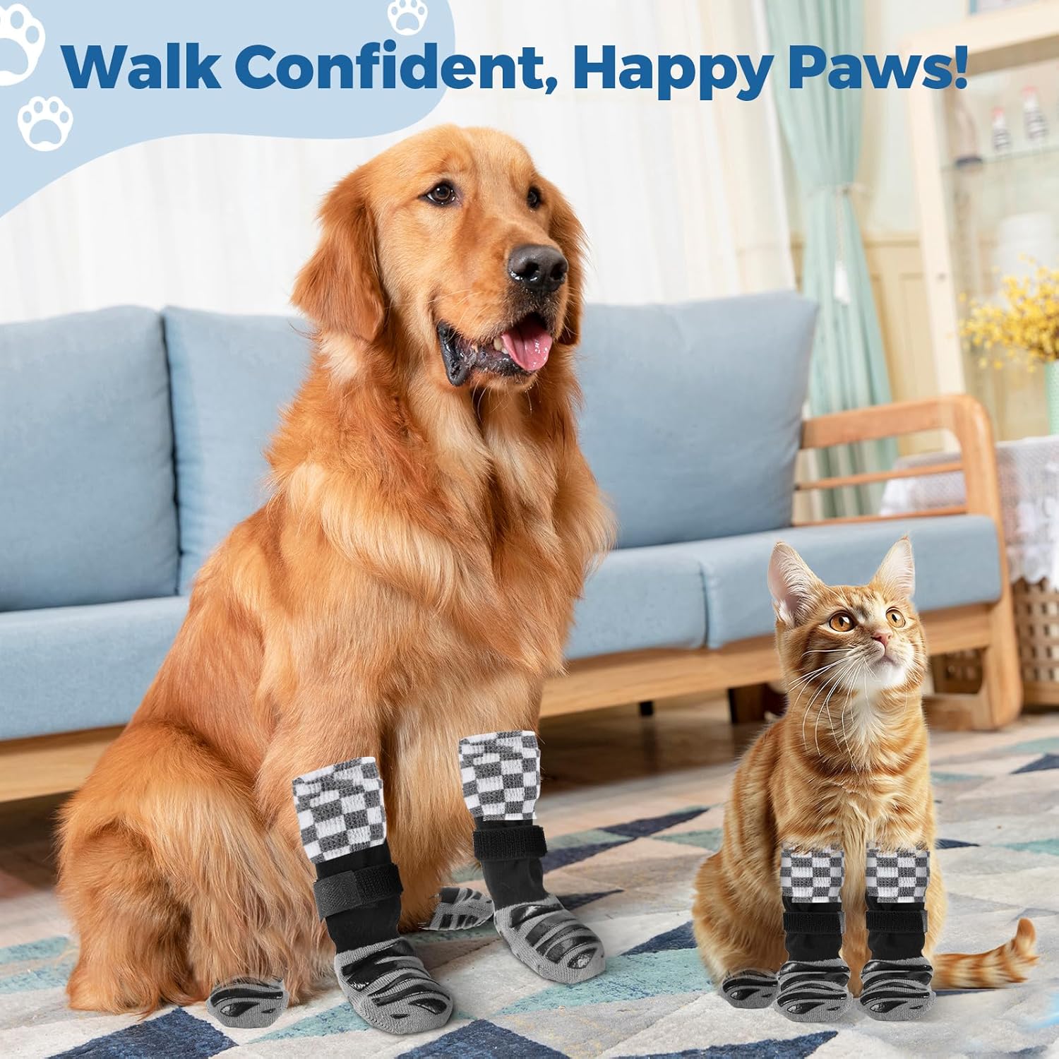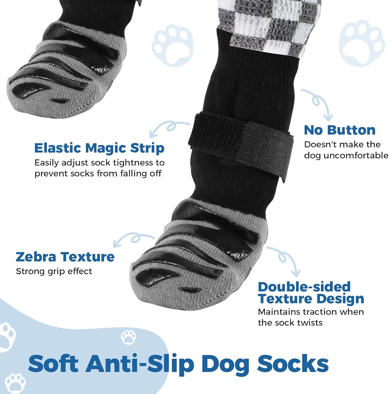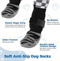 【Dual sided non slip dog socks】 The dog booties for hardwood floors have cute zebra stripes on both sides of the dog paw protector, which are rubberized non-slip material, these scratches provide stronger traction when your dog walks on smooth hardwood floors. They still work even if the puppy shoes twist.