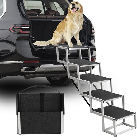 - SUPERIOR DESIGN DOG RAMP FOR CAR: Our Dog Stairs for Large Dogs feature an extra-wide and stable stairway, reducing pressure on your furry friend's legs. Designed to be gentler on joints and prevent injuries, these stairs are ideal for short-legged, elderly, disabled, or injured dogs.
