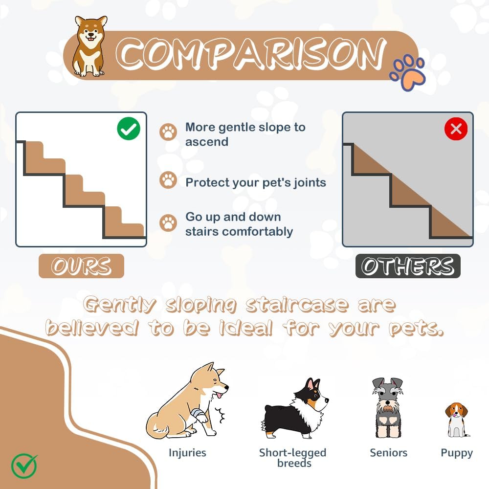 - Gently Sloping Pet Stair: HIDOG dog stair ramps are specifically placed for use on stairs. Our pet ramp converts the step height of the stairs into a gentle slope, which is more suitable for small dogs (Yorkshire, Maltese, Chihuahua, Pomeranian, etc.) to climb easily and comfortably. And it effectively protects your dog's joints and reduces the probability of injury.