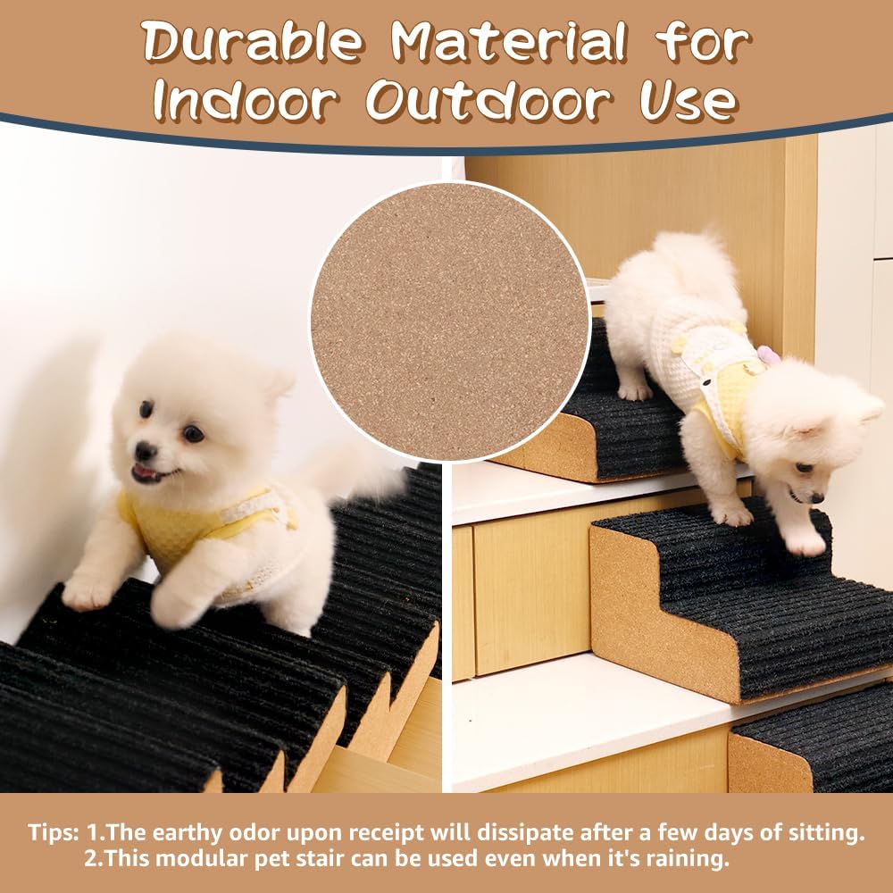 - Durable Material for Indoor Outdoor Use: The dog stairs for small dogs are made from cork oak. The material is sturdy enough to improve stability and also allowing the dog steps to be used both outdoors and indoors. It will not be damaged by rain. For the first few days after receiving there will be a natural and safe “earthy” smell. The smell will dissipate after a few days of sitting.