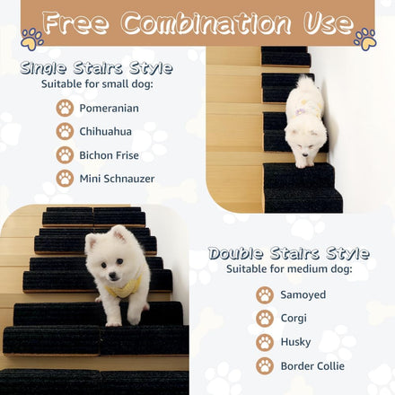 - Free Combination Use: Our dog ramp for small medium dogs are available in 1-piece and 4-piece sets, with different combinations to meet your needs. Each piece measures 9.8"L x 9.6"W x 5.9"H. When you place two pet stairs side by side for use, each step is larger and can be used for medium pets.