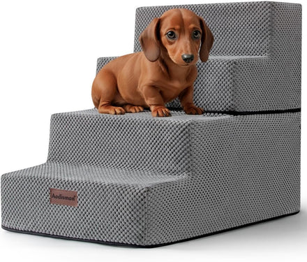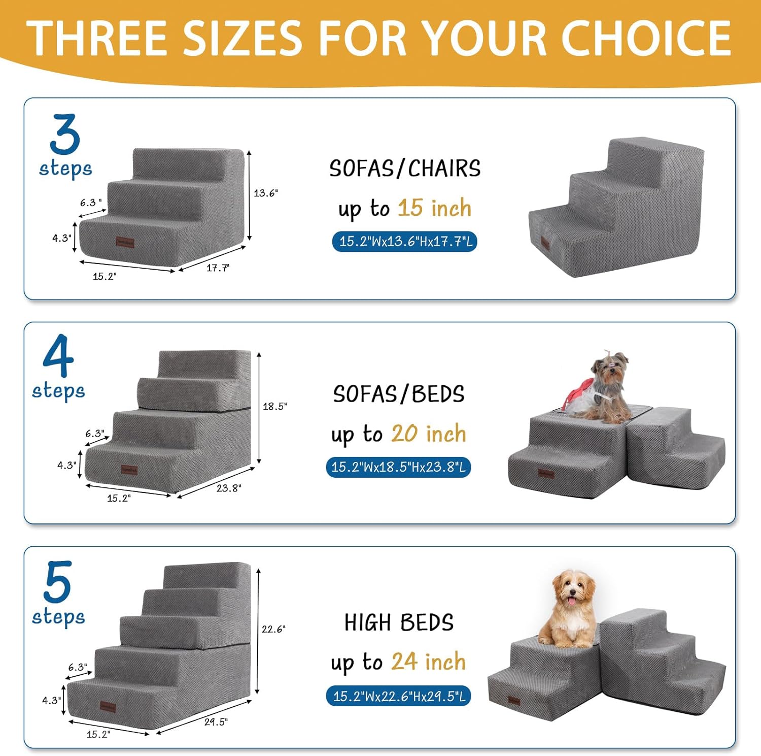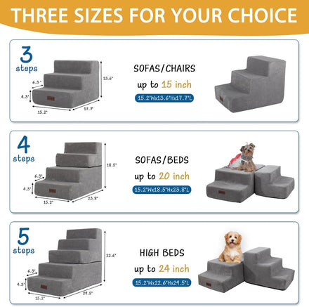 - 3 Size Options - This pet stairs comes in 3, 4, and 5-step configurations for you to choose from. The 3-step Dog Stairs stands at a height of 13.6 '', suitable for couches and low beds (no higher than 15"). The 4-step Dog Stairs reaches a height of 18.5'', Convenient for pets to climb onto sofas and beds (no higher than 20"). The 5-step Dog Stairs reaches a height of 22.6'', assists pets in climbing onto higher beds (no higher than 24")