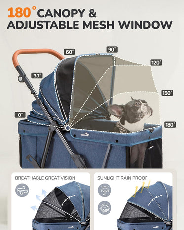 - 【All-Around Ventilation with Adjustable Canopy】Features a 180° foldable canopy and mesh windows on all sides, keeping your pets cool and visible while blocking harsh sunlight. Ideal for warm weather walks and outdoor adventures with your dog stroller.