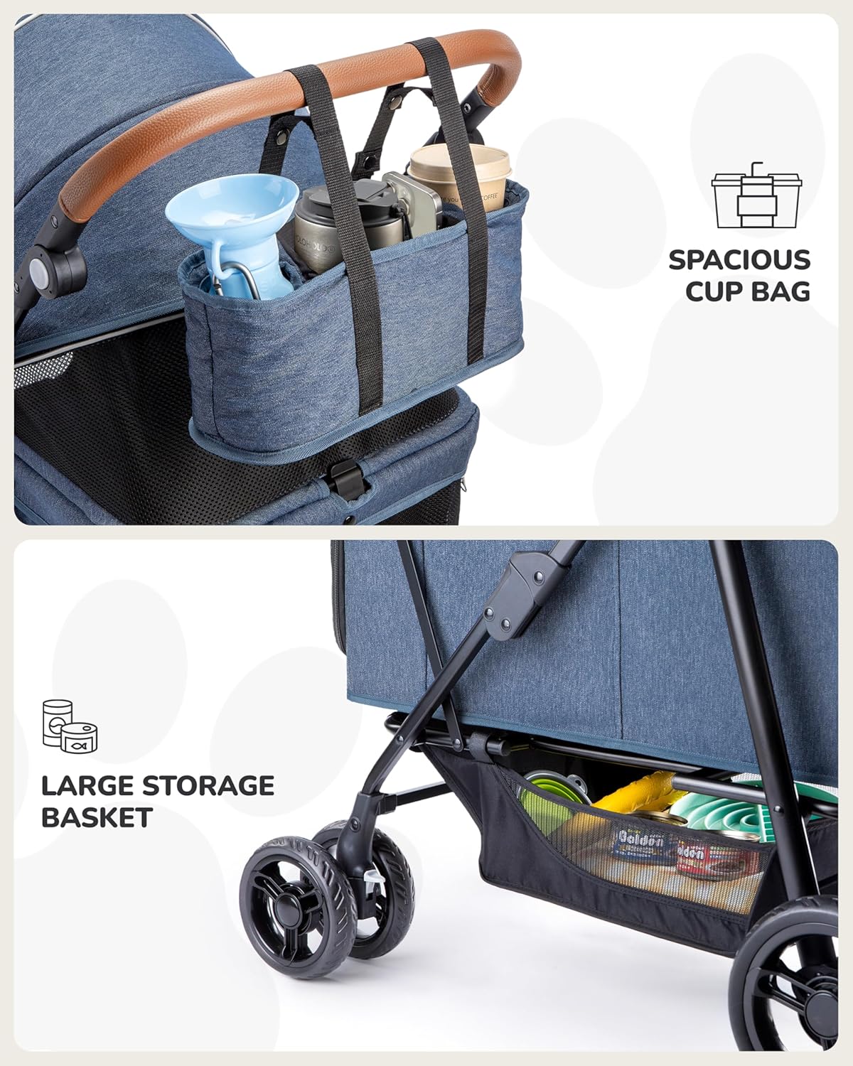 - 【Convenient Storage for Travel Essentials】Includes a front cup holder and a spacious undercarriage basket to carry water, treats, waste bags, and more. Whether it's a vet visit or a park stroll, this pet stroller keeps everything you need within reach.