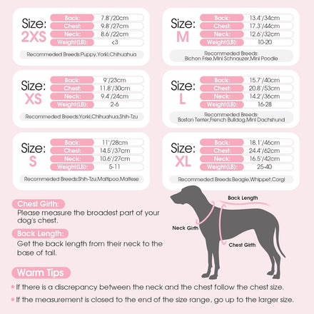 • Suitable for: small and medium size pets, do not fit for large breeds. Refer to chest girth first to choose. XS-XL 5 Sizes Available, M: Chest 17.3", Back 13.4".