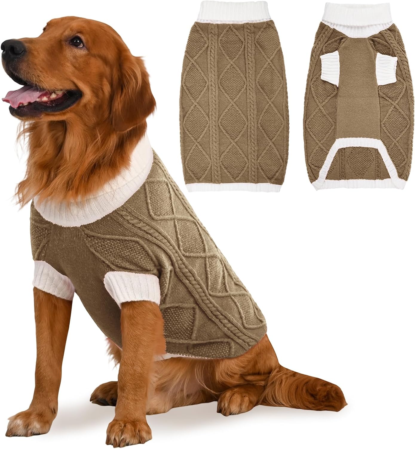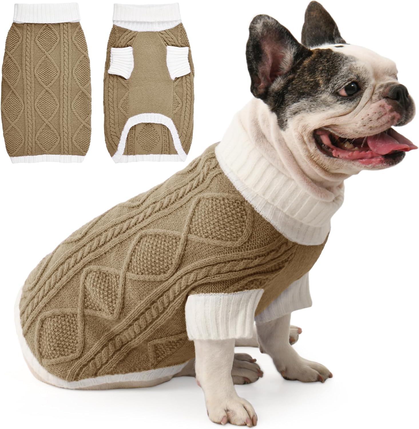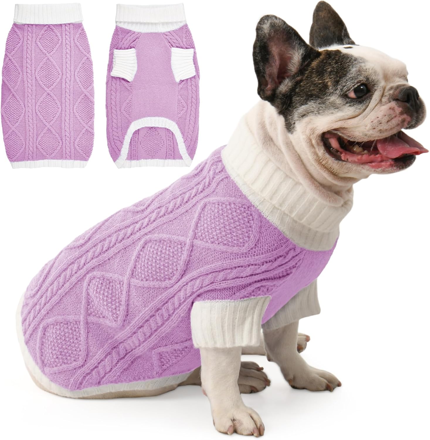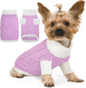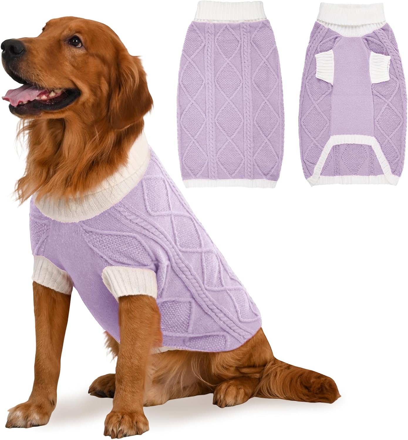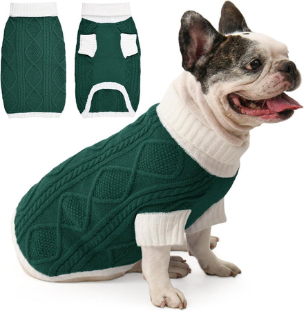 This dog sweater features a chic contrast knit with a diamond cable pattern on the back, bringing stylish texture and warmth. The turtleneck and mid-length sleeves enhance comfort and seasonal coverage, while the elastic fabric provides a snug, flexible fit. Available in a range of coordinated tones, it’s perfect for your dog to shine during Christmas, Thanksgiving, and New Year.
