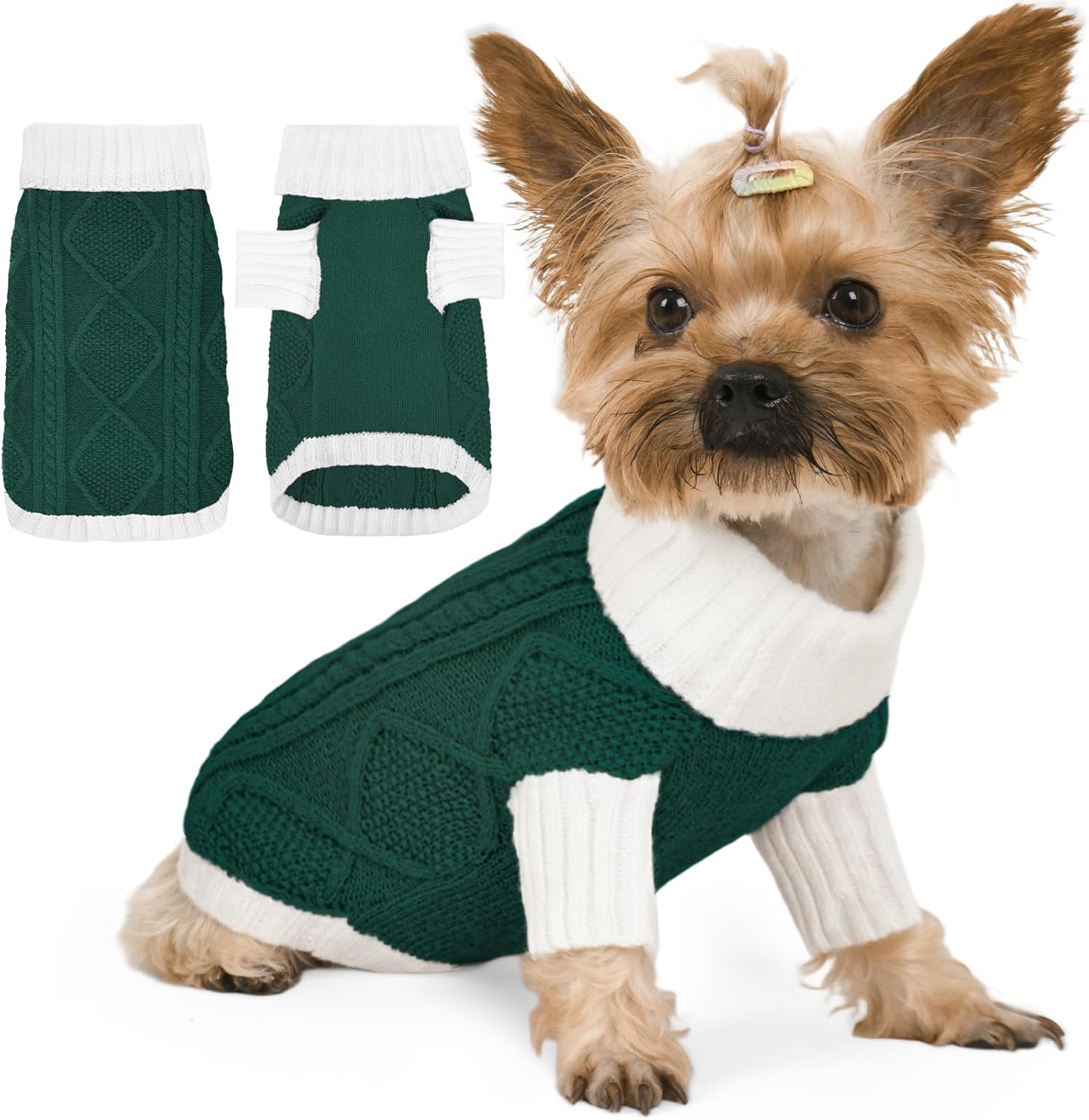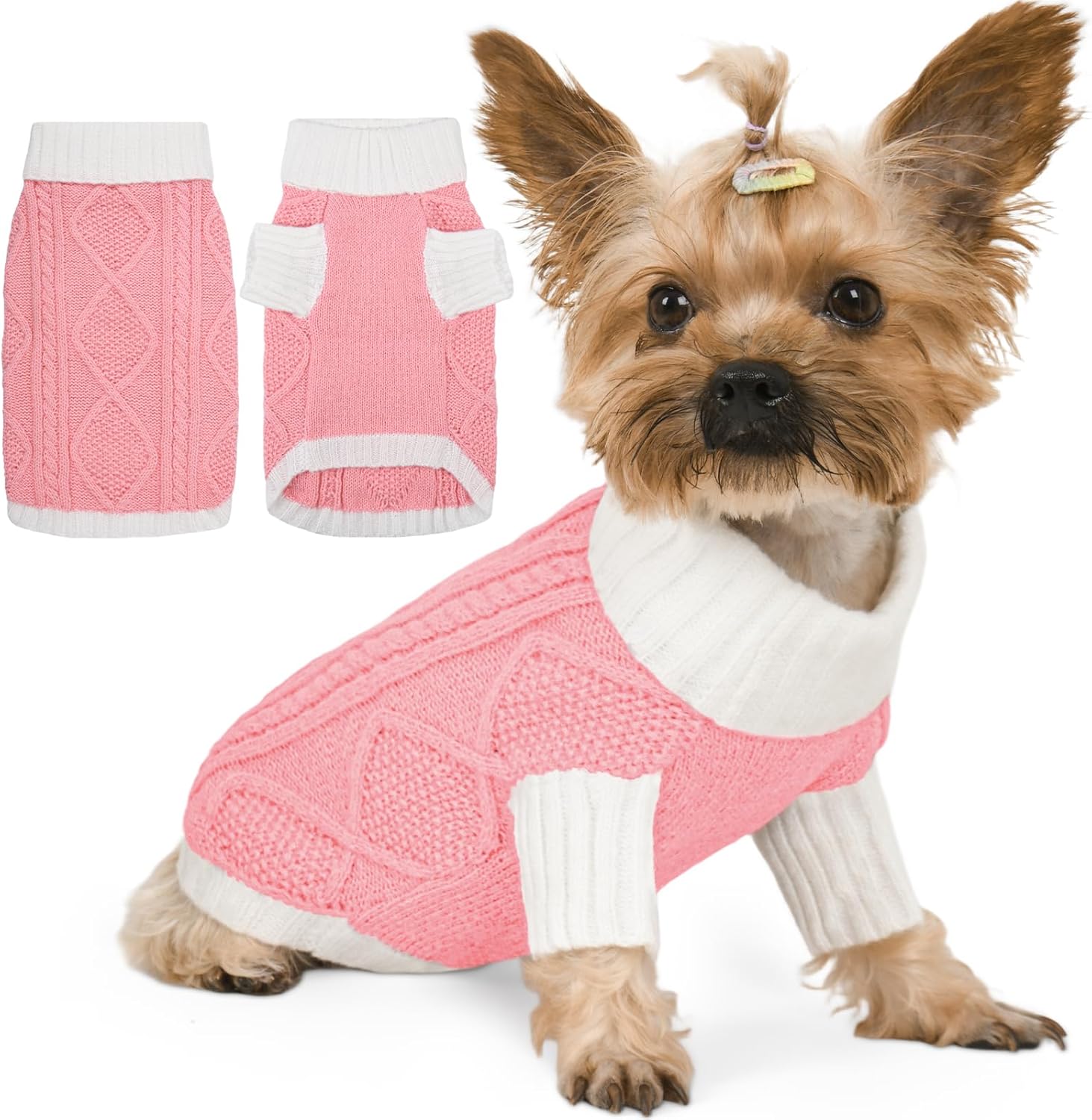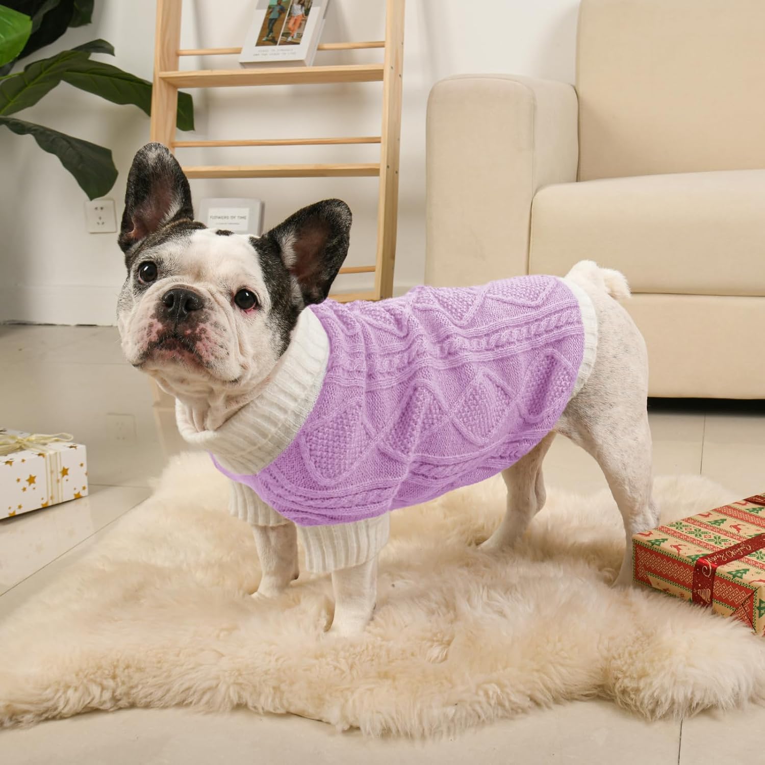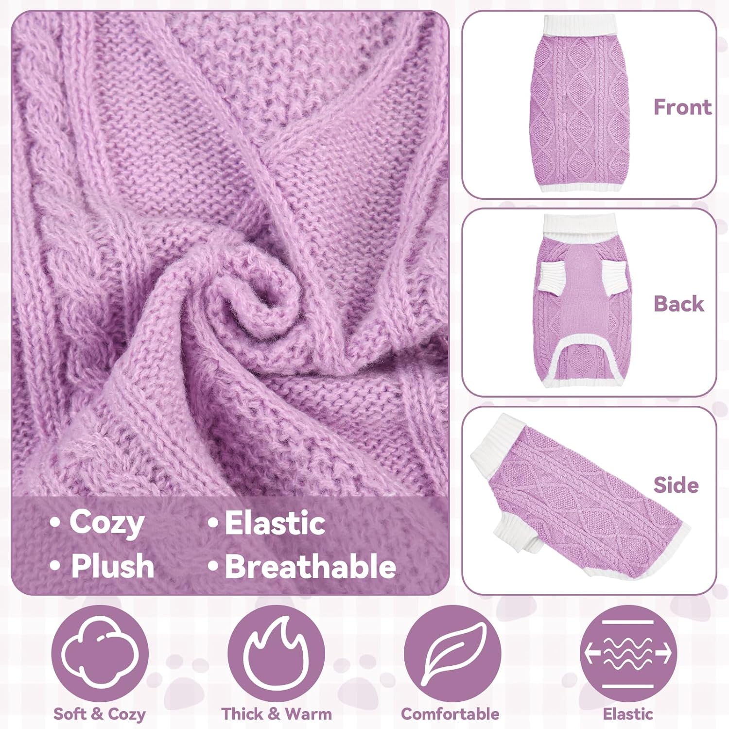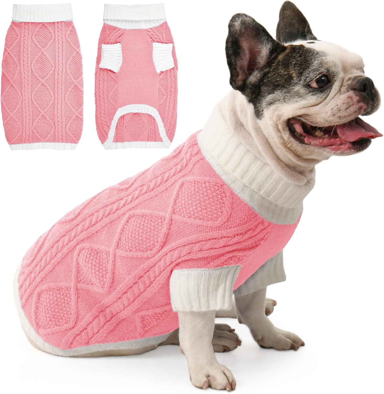 This dog sweater features a chic contrast knit with a diamond cable pattern on the back, bringing stylish texture and warmth. The turtleneck and mid-length sleeves enhance comfort and seasonal coverage, while the elastic fabric provides a snug, flexible fit. Available in a range of coordinated tones, it’s perfect for your dog to shine during Christmas, Thanksgiving, and New Year.