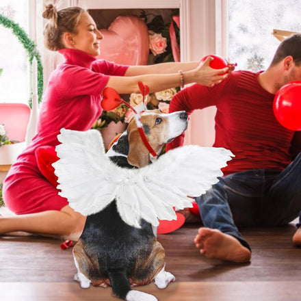 Heart-themed dog apparel includes a white angle feather wing and a red heart headband. The highlight is plush white angel wings, coupled with a quiver of heart-theme red headband. Whether your dog is playing at the park or posing for pictures, this outfit is comfortable, cute, and perfect for the season of love.