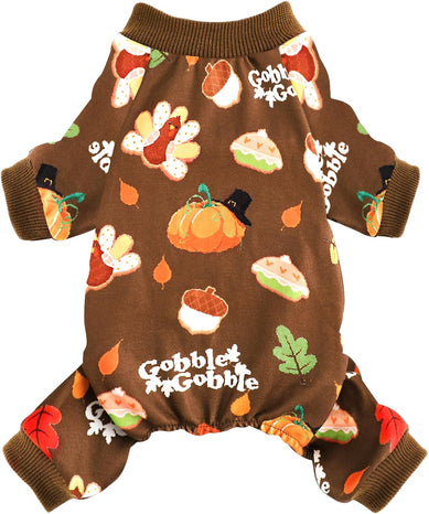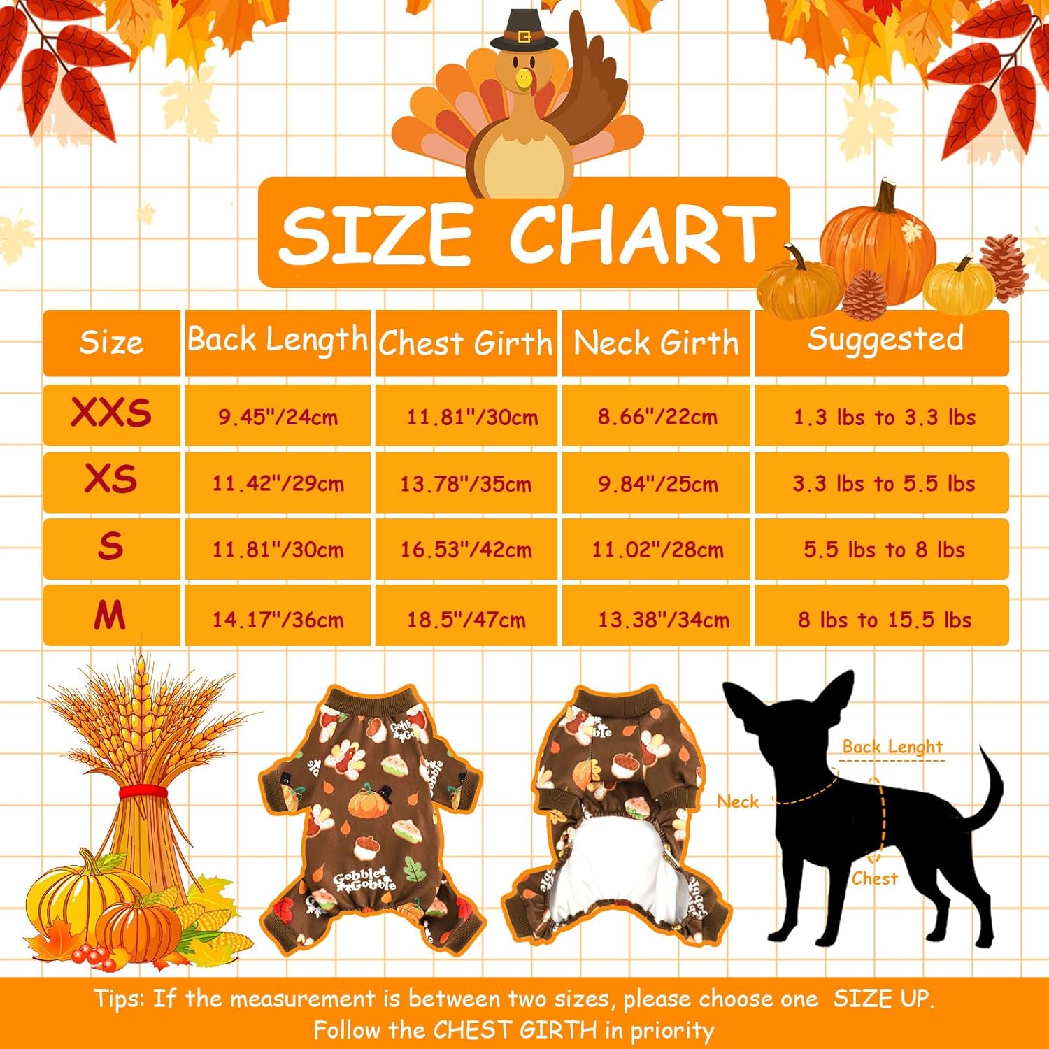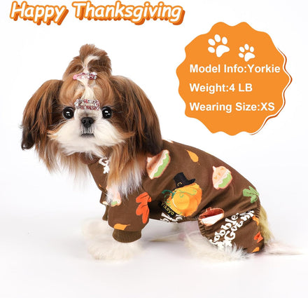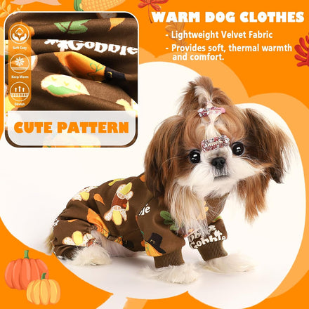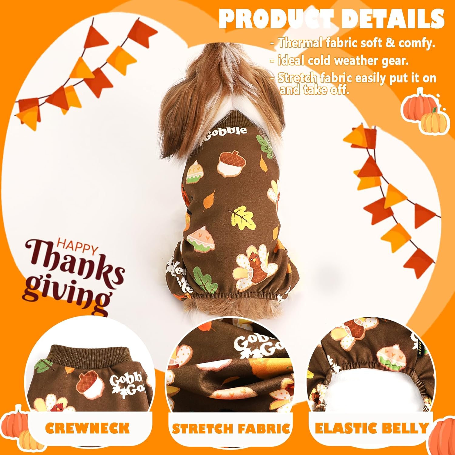 - Pumpkin Dog pajamas: Dog thanksgiving pjs with unique turkey, maple leaf, pumpkin pattern,represents the autumn harvest. The dog jumpsuit has orange, brown color, the tiny dog clothes is cool style. With the cute warm dog clothes, adds charm to your fur baby. This fall winter small dog clohtes recommended for male and female dogs.