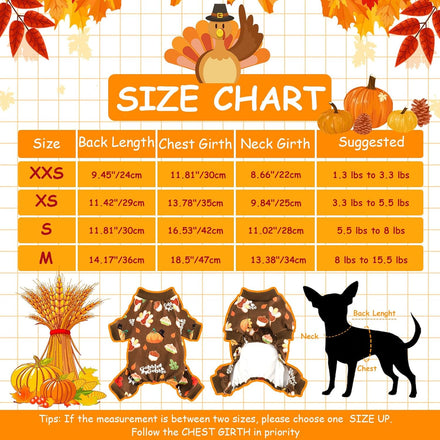 - Size: Size XX-Small, Back:8.26" ,Chest:11.81". Recommended for pet under 4 lbs (Eg,Tiny Puppies, Teacup, Chihuahua, Yorkie, Pomeranian, Rabbits, Kitten). Our dog thanksgiving outfit only suitable for small dog breed and cats,not for any large dog breed.
