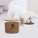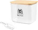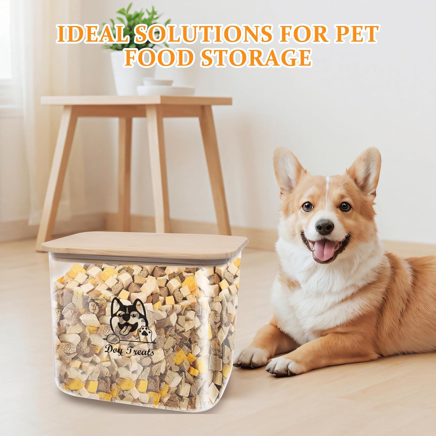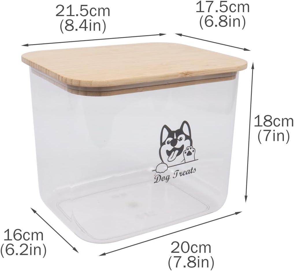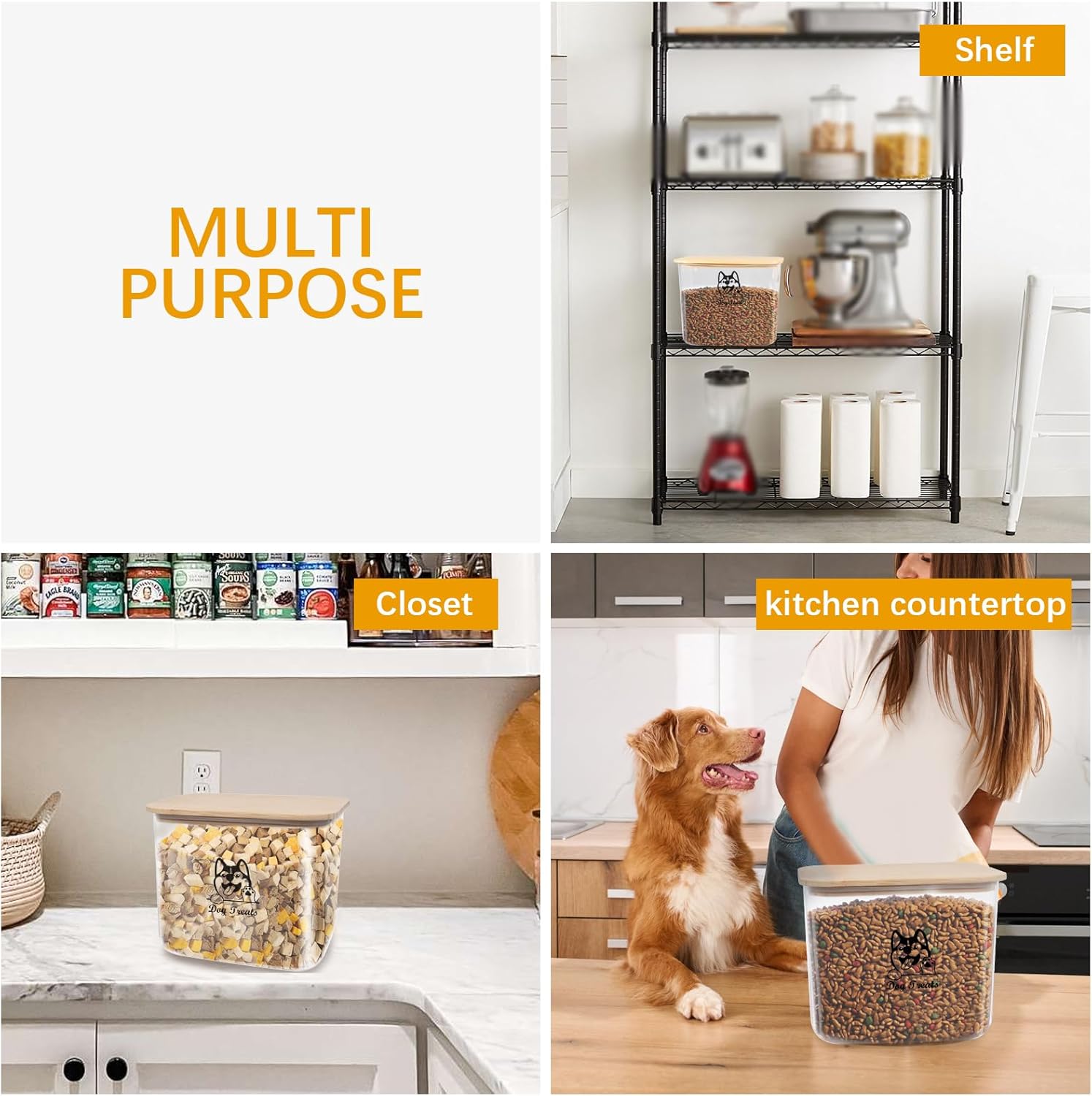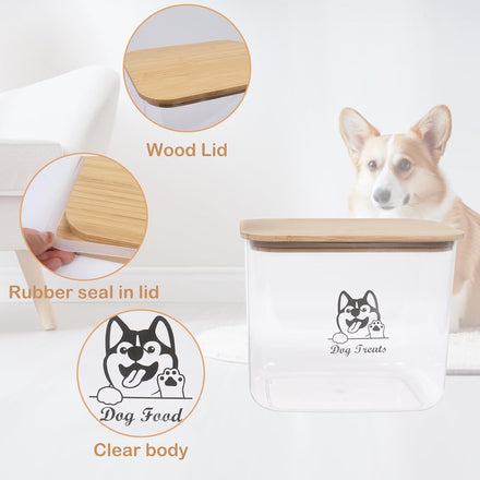 - Dog food storage container - Keep your dog food fresh, dry and out of reach of your four legged friends by storing it in the plastic dog food container. This airtight dog food storage container holds up to 4 lbs of food or treats and has a sturdy wood lid to keep everything secure.
