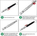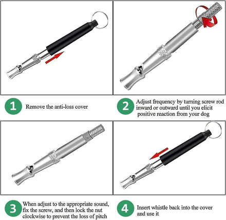 - 【ULTRASONIC DOG TRAINING】: You can adjust the pitch to get the right frequencies, loosen the sonic adjustment screw while blowing the air in from the air inlet, turn the adjustment lever to adjust to the optimum pitch. After the adjustment lever is turned, tighten the sonic adjustment screw. This is a ultrasonic dog whistle that quickly stops barking and helps you teach your dog obedience and learn basic skills, like sit, paw, lay down, up.