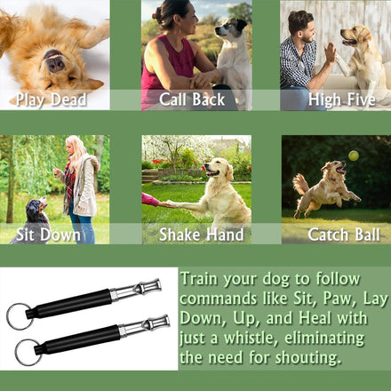 - 【Remote Command】The ultrasonic sound can travel up to 2000 meters, making it possible for your dog to respond to commands even when out of sight. Train your dog to follow commands like Sit, Paw, Lay Down, Up, and Heal with just a whistle, eliminating the need for shouting.