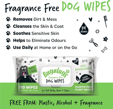 No bath, more play! Bugalugs Biodegradable fragrance-free dog wipes are enriched with a natural formula utilising the soothing and cleansing benefits of chamomile, cucumber, aloe vera, shea butter and vitamin E for a gentle cleanse. Multipurpose use as dog wipes for bums, dog ear cleaner wipes, dog wipes for smelly dogs, cat eye wipes or dog face wipes. Created using earth friendly plant-based bamboo fibres sourced from a FSC Forest which are 100% plastic free & biodegradable. Bugalugs wipes are perfect for an on the go, effortless clean that requires no water or rinsing. With a special textured design specifically created to agitate and remove dirt swiftly from your pets coat and skin, our wipes remove unwanted odours without causing irritation. Simple and effective, our extra-large, high quality, super thick dog wet wipes are excellent value with 110 20cm x 20cm dog cleaning wipes per pack size! Easy to use and travel friendly packaging, simply open the lid and peel back the resealable label. Remove wipe and gently clean full body, face, bum & paws making sure to use both sides of the wipe, with no rinsing required. Close the lid after use to ensure the wipes do not dry out. Safe for use every day on all pets including dogs, puppies, cats, horses, and small animals. Why not try out our other Bugalugs products these include wrinkle wipes for bulldogs, dog shampoo sensitive skin, dry shampoo for dogs, puppy shampoo from 8 weeks, puppy accessories and dog nail clippers.