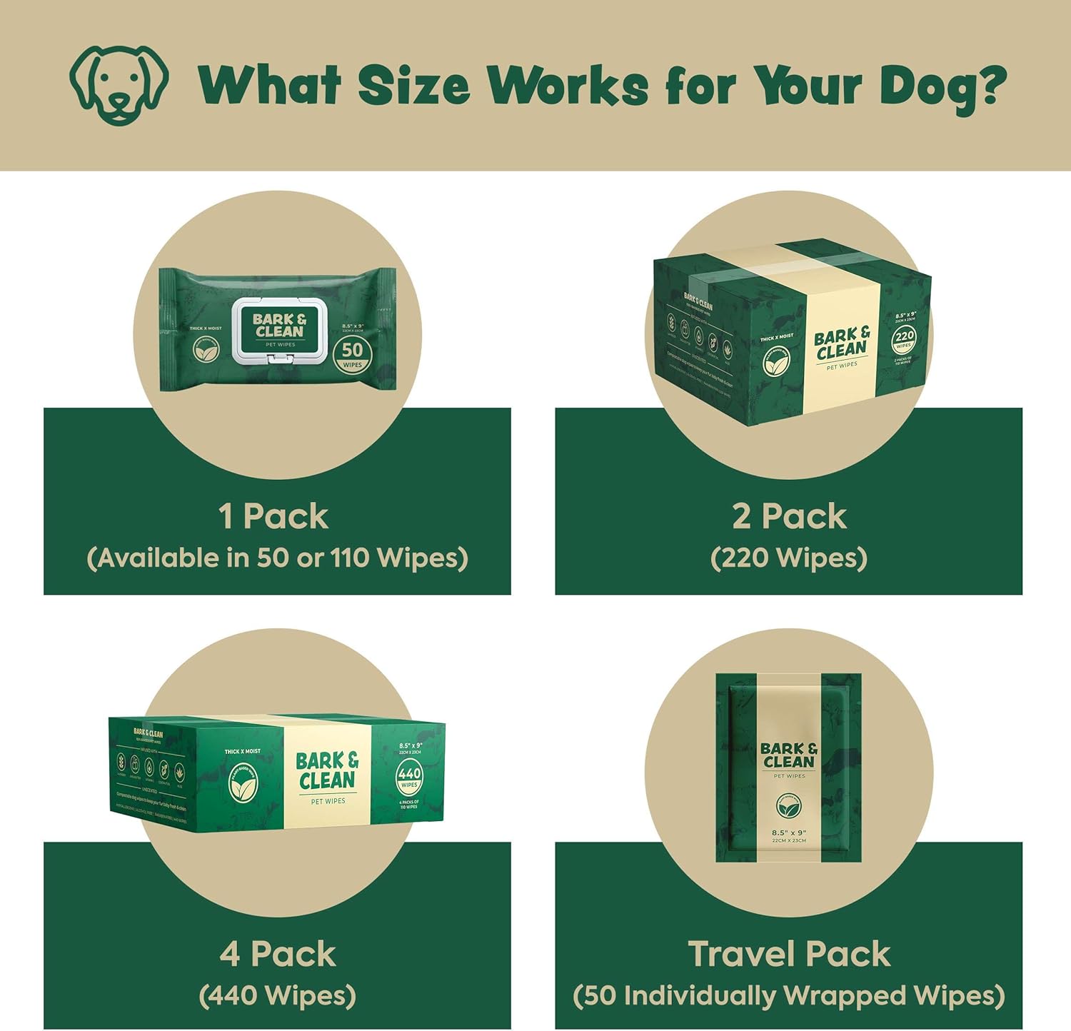 - Our dog face wipes come in packs of 50 and 110 as well as a travel option with indivually-wrapped wipes.
