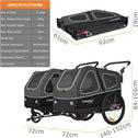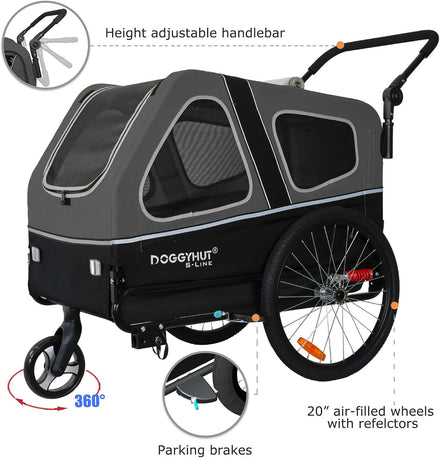 The Doggyhut S-Line XL Pet Bicycle Trailer & Stroller 2 in1 is a great way to maintain an active lifestyle with your pet. If you want to get in a bike ride, but your pet isn’t up to it, you can still take them along. Easy conversion between trailer & stroller. It could be used as a training crate at home or pet car seat in the car Our design features an extra-wide wheelbase and a lower center-of-gravity to provide outstanding ride stability and easier access for pets getting in and out of the cabin. Full suspension system alleviates bumps and jostles on any terrain.The front door on the trailer includes a zippered, mesh screen layer plus a zippered, clear vinyl layer to block wind and weather. The zipped sunroof on the top provides ample airflow and room for pets to peek their heads out and look around. An optional washable pet mat (sold separately) keeps pets comfortable on long rides Assembles quickly and folds down for easy storage and transport. NO PETS LEAVE BEHIND!