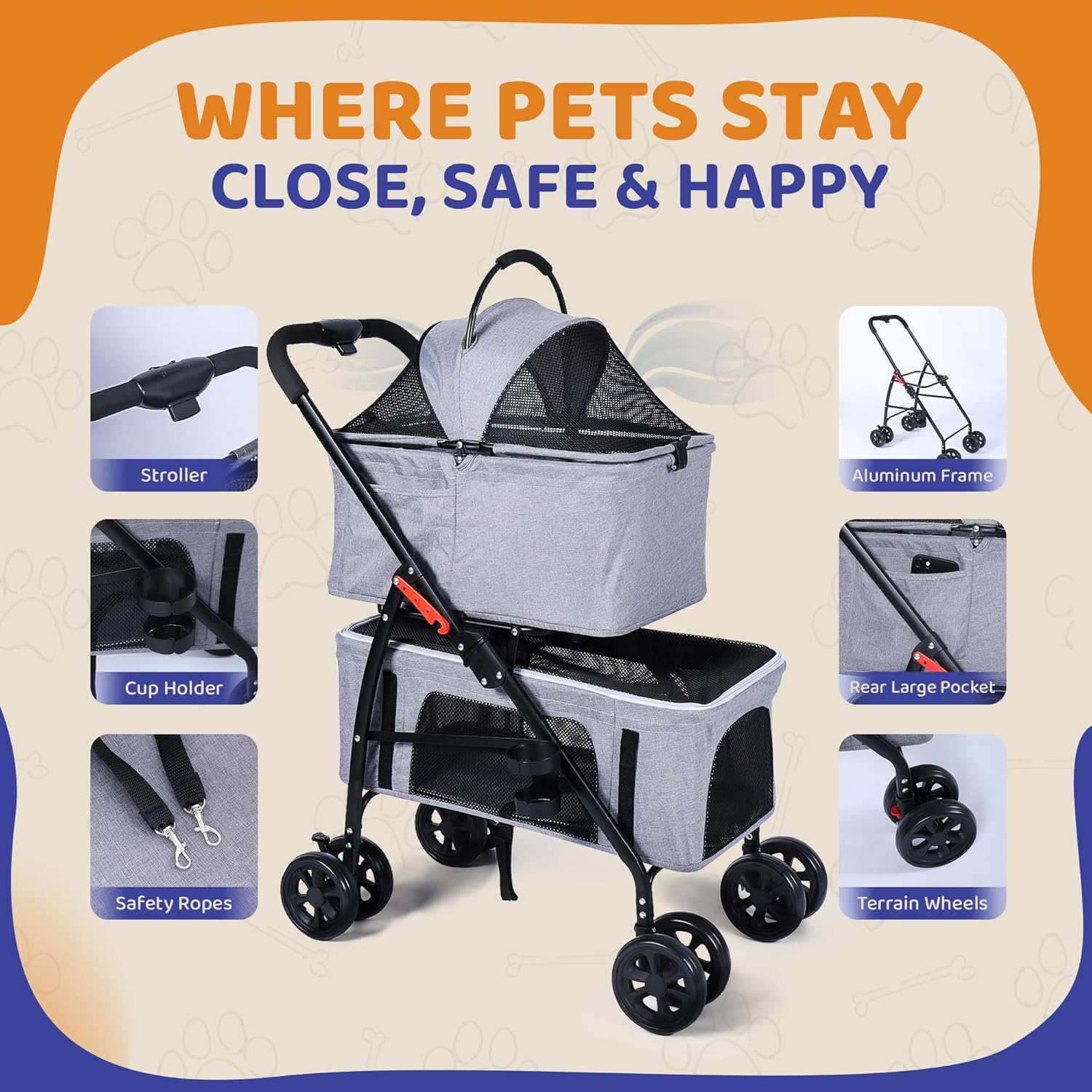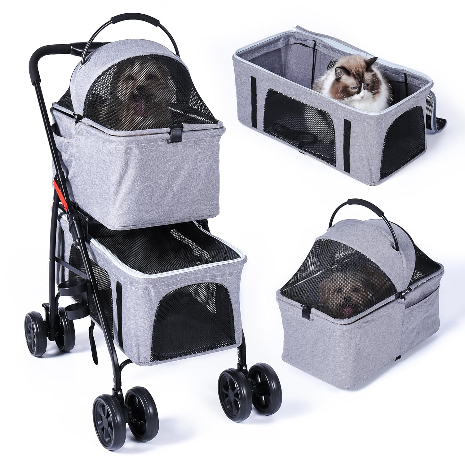- MULTI-PURPOSE DETACHABLE BASKETS - Our pet stroller for 2 cats is versatile and can be used for multipurpose. It can be used as a stroller, upper layer can be used as a separate pet carrier that can be placed in the car seat and lower layer can be used as a separate nest.