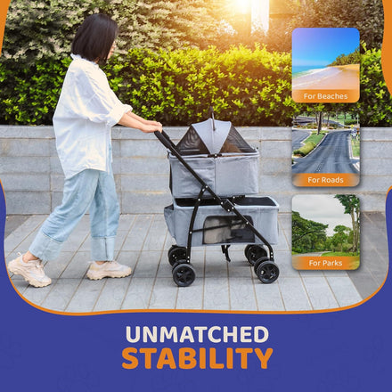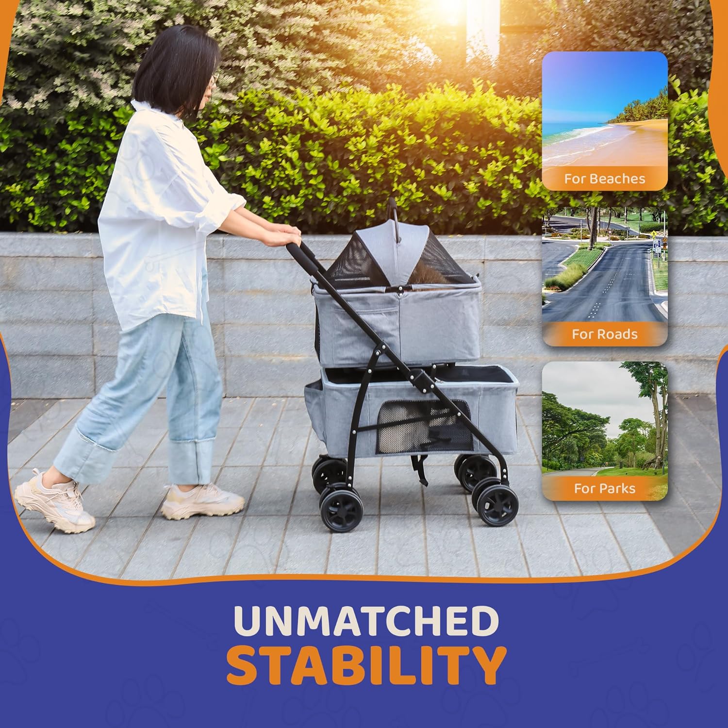 - IMPROVE YOUR TRAVEL EXPERIENCE - The double dog stroller comes with double wheels on all sides which provides smooth, stable moving, ideal on grass, wood and other stiff hard road or soft surface. Suitable for senior dogs, energetic puppy, your kitten duo, our pet carrier has everything you need to enjoy a relaxed time with your beloved pet.