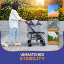 - BUILT TO LAST - The pet double stroller is crafted with premium quality, breathable & long-lasting material. With a heavy duty aluminum frame, all terrain wheels, leather push handle, safety tether, anti-shock stabilizers, a safety belt for secure riding, waterproof carrier pads, every walk feels like gliding on air.