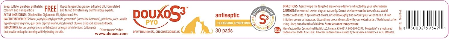 Formulated with antibacterial and antifungal ingredients to help soothe, clean and strengthen the skin barrier. Moisturizes and detangles the fur to leave the coat soft and shiny. A wipe for daily treatment of infected areas or for skin areas that need antiseptic cleansing. DOUXO is the 1 non-prescription topical brand used and recommended by U.S. veterinarians for treatment of dogs and cats with infections/inflammatory dermatological diseases.