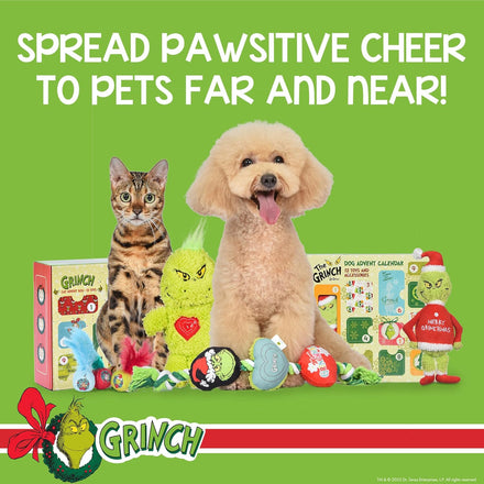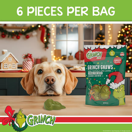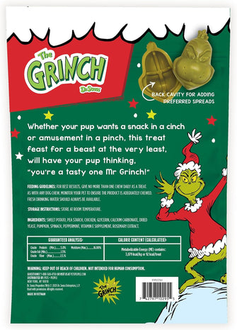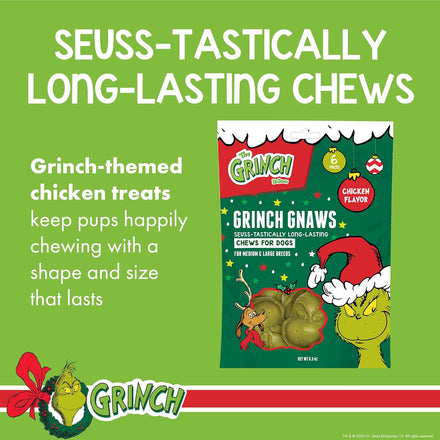 Turn your pup into a mean, green chewing machine with The Grinch Gnaws Chicken Dog Treats – a festive and flavorful way to celebrate the season! These Seuss-tastically long-lasting dog treats are designed especially for medium and large breed dogs, giving them a satisfying, extended chew time. Each chew features the iconic Grinch face and a fun surprise: a back cavity designed for spreading your dog’s favorite treat spread. That means more enrichment and even more tail wags. Whether you're looking for Christmas dog treats, dog stocking stuffers, or a memorable Christmas gift for dogs, this officially licensed Dr. Seuss holiday treat for dogs is sure to bring joy to your furry best friend. And with six delicious chicken-flavored chews per bag, you’ll have enough to share! Make your pup’s heart grow three sizes this season with these Grinch dog gifts that are as adorable as they are delicious.