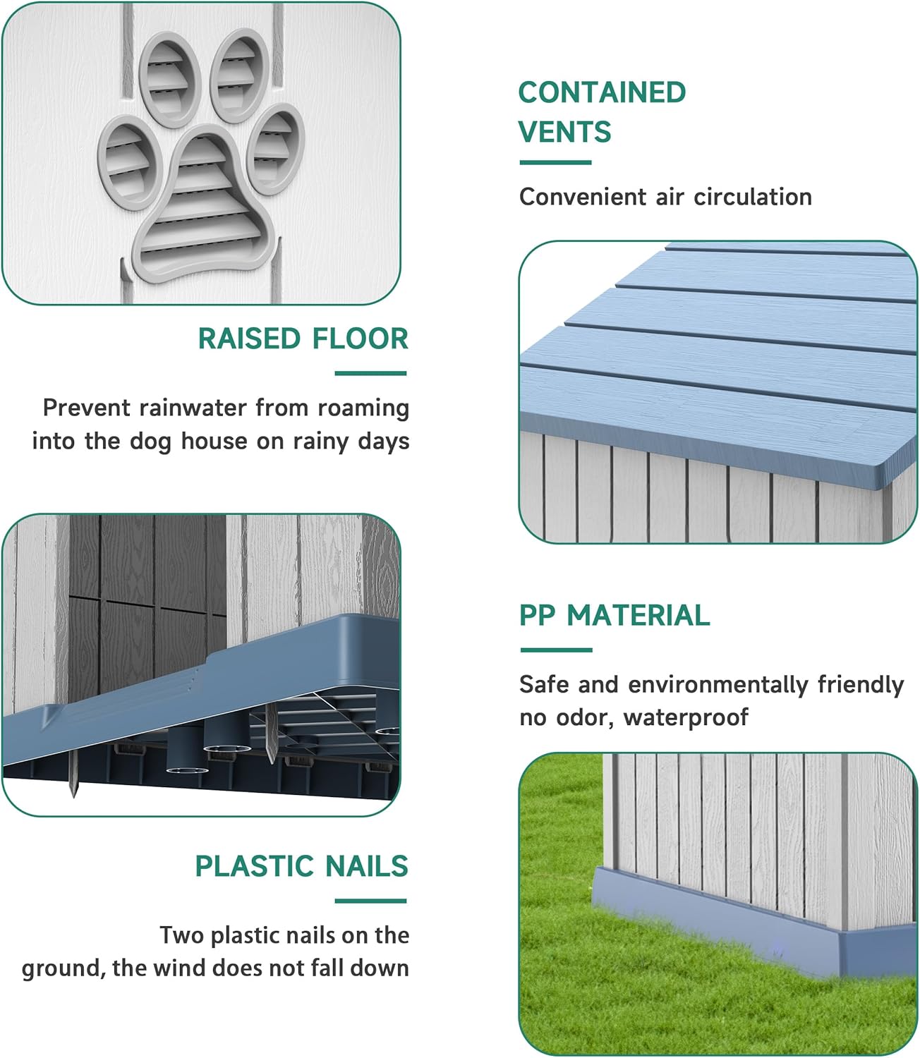 - 🐕Sturdy and Durable: This big dog house is made of high quality PP (polypropylene) material, which is extremely durable.The PP material is scratch-resistant, abrasion-resistant, and also waterproof. It can withstand all kinds of weather conditions, such as rain and sunlight exposure, and is not easily damaged.