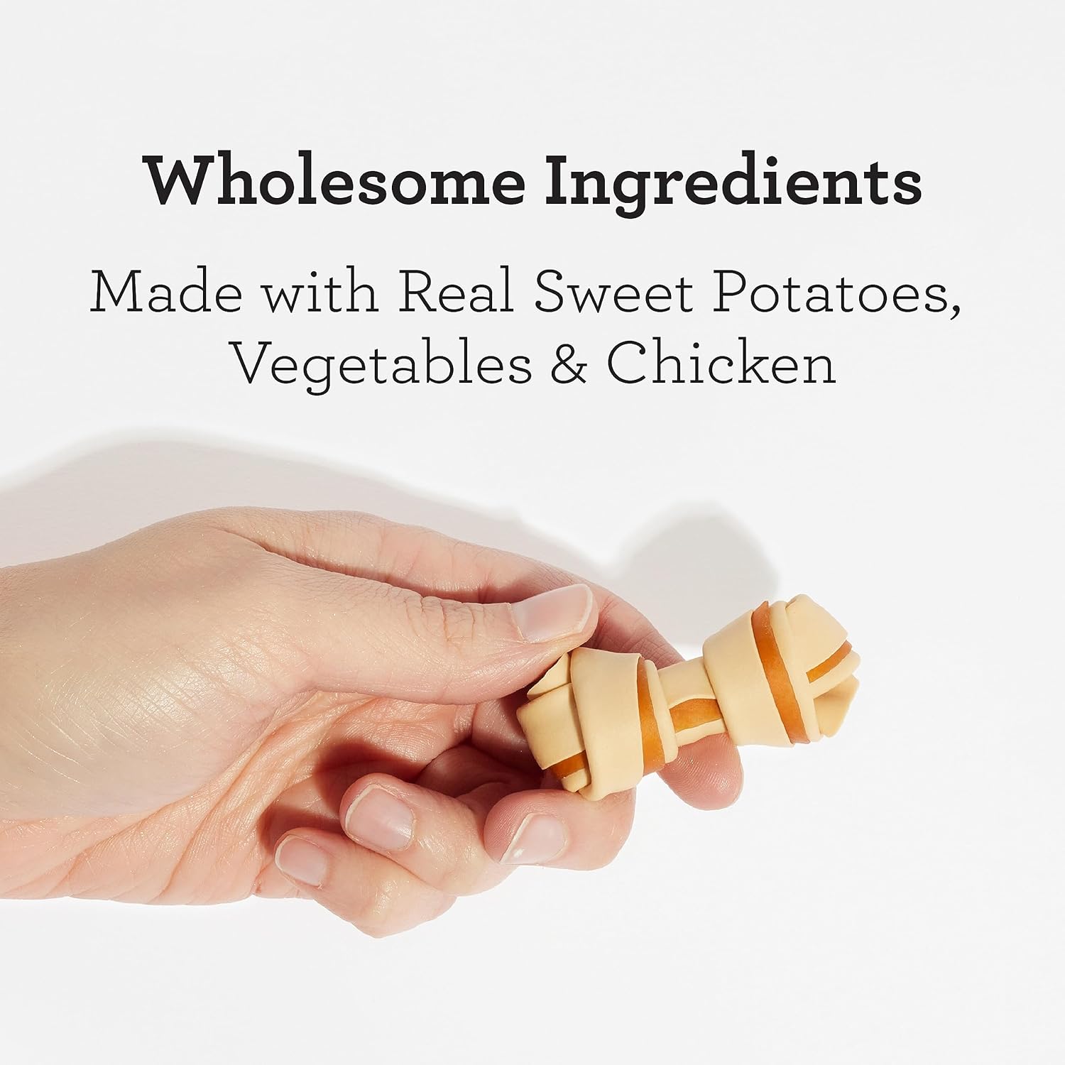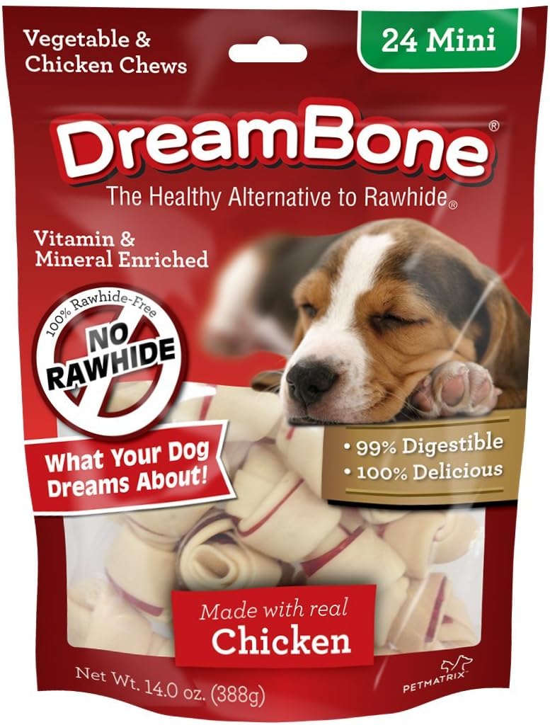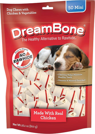 DreamBone® chews have all the benefits of a rawhide chew…without the rawhide. No-rawhide DreamBone chews are made with real chicken, beef, bacon and cheese or sweet potato and wholesome vegetables for a scrumptious taste dogs can’t resist! No-rawhide DreamBone® Mini Chews for dogs are made with real sweet potatoes, chicken and other wholesome vegetables for an irresistible taste dogs dream about. Enriched with vitamins and minerals, these chews are a healthy alternative to rawhide. Treat your small or toy-sized pup to these highly digestible and 100 percent delicious mini chews. DreamBone Mini Chews promote healthy teeth and gums through the natural action of chewing, making them a treat both you and your dog can love. Give your dog 1 to 2 DreamBone Mini Chews per day. Always supervise your pup during chewing activity and provide access to fresh, clean water. These chews are intended for intermittent or supplemental feeding only. Store in a cool, dry place. After opening, reseal or store in an airtight container to preserve freshness. The experts at DreamBone brand want you to have healthy, happy dogs. We know that your dog is more than a pet – they’re family. Chewing is an essential, healthy and enjoyable activity for dogs. Dog chews help keep teeth clean, jaws strong and are mentally stimulating to help prevent boredom and destructive behavior. DreamBone chews help satisfy a dog’s natural chewing instinct.