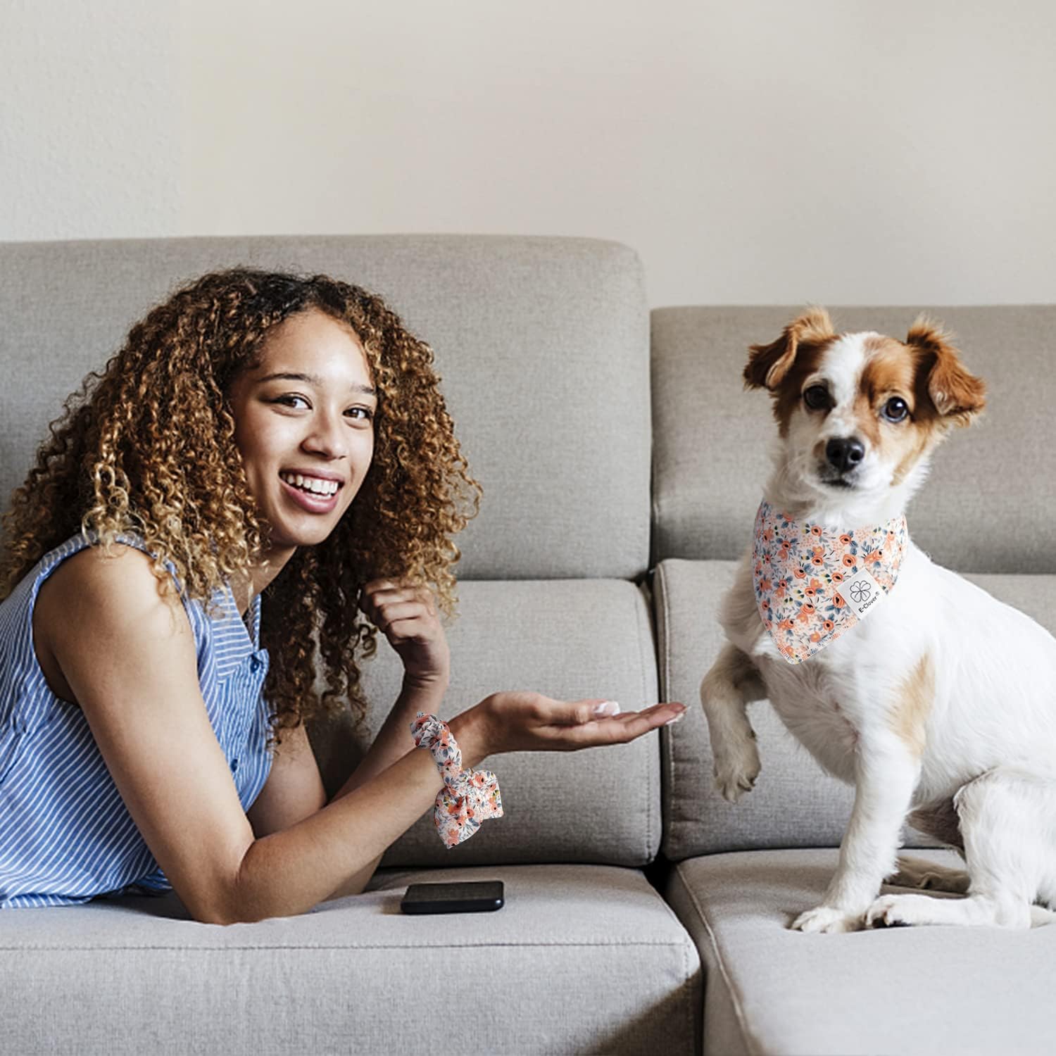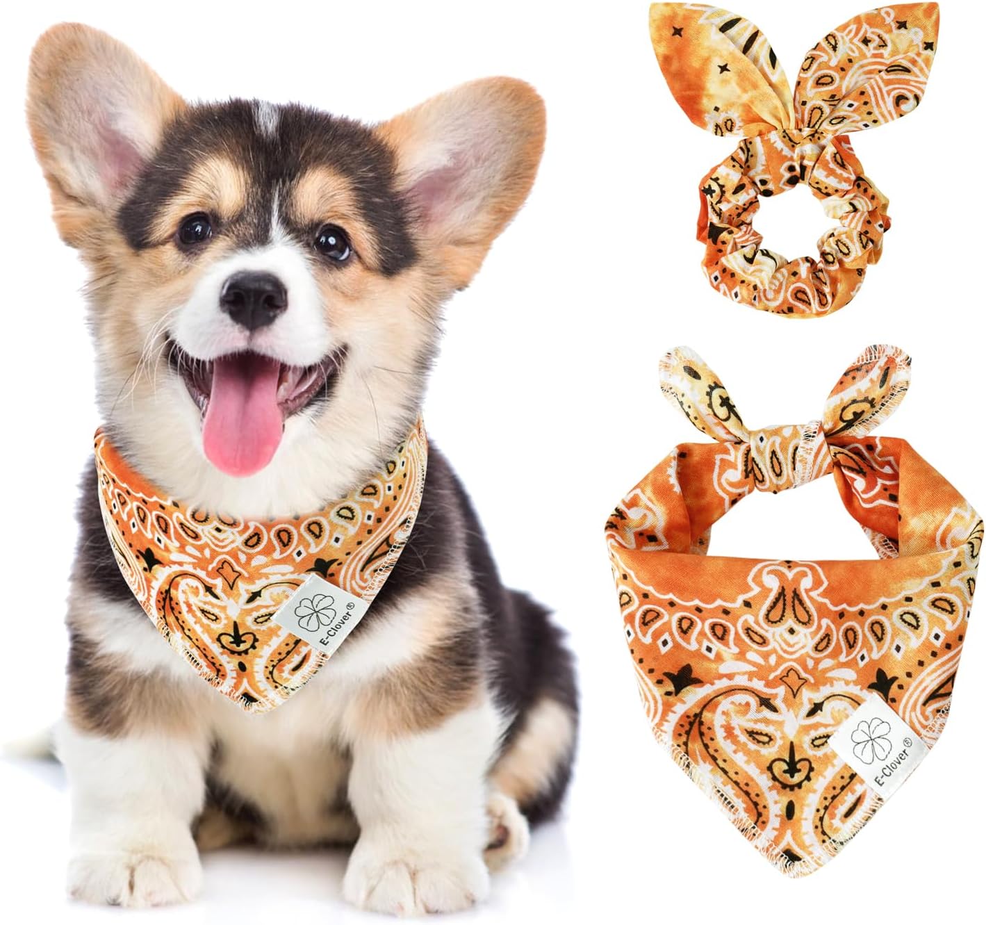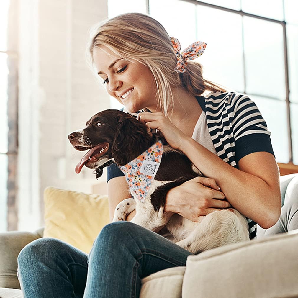 - Matching Bandana and Scrunchie Set- It’s full of love when your pets is wearing the flower bandanas and you are wearing the bow scrunchies. When traveling, sleeping, taking photos or daily warking, adorable dog spring bandana and floral scrunchie is a pretty accessories. The the hair tie can be worn as a wrist accessory and hold your hair. Beautiful dog drool bibs and scrunchie with orange, yellow floral and navy blue leafs pattern, it’s nice photo props.