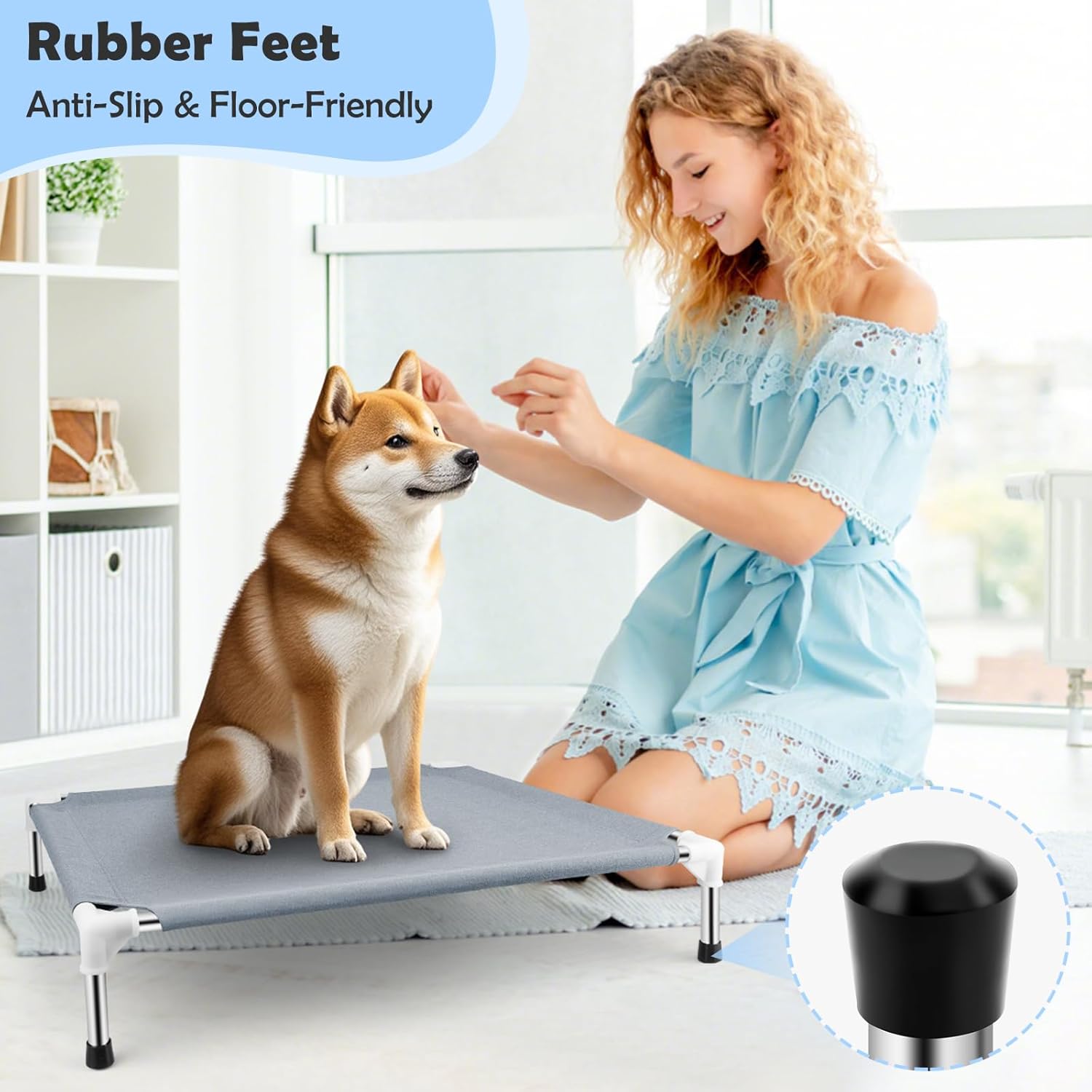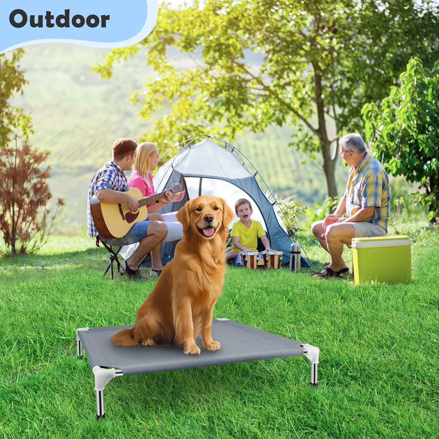 - [Travel Dog Bed] - Our outdoor dog bed is made of high-quality stainless steel that's resistant to peeling and fading. It's perfect for harsh outdoor environments. Indoors or outdoors, summer or winter, campsite, pool or backyard, you can take this outdoor dog cot to accompany your pooch. It keeps them off the ground, ensuring a cleaner and cooler play and rest experience.