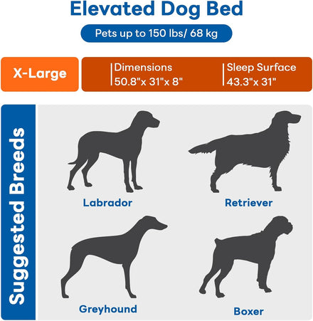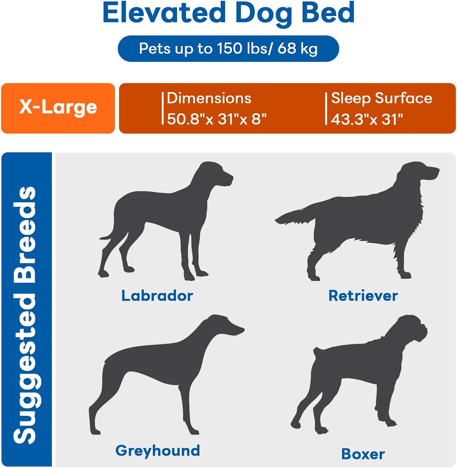 - 【Product Dimensions】This raised dog bed measures 50.8" L x 31.5" W x 8" H (elevated sleeping area: 43.3" x 31") .Supports dogs up to 150 lbs
