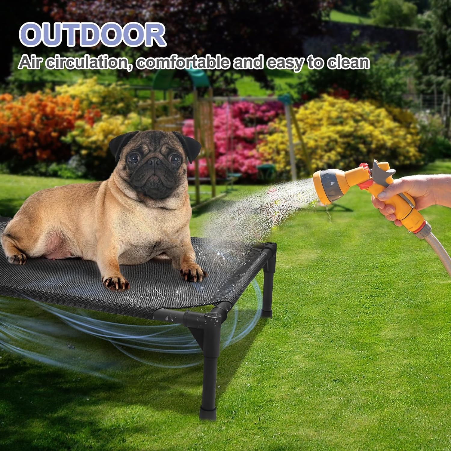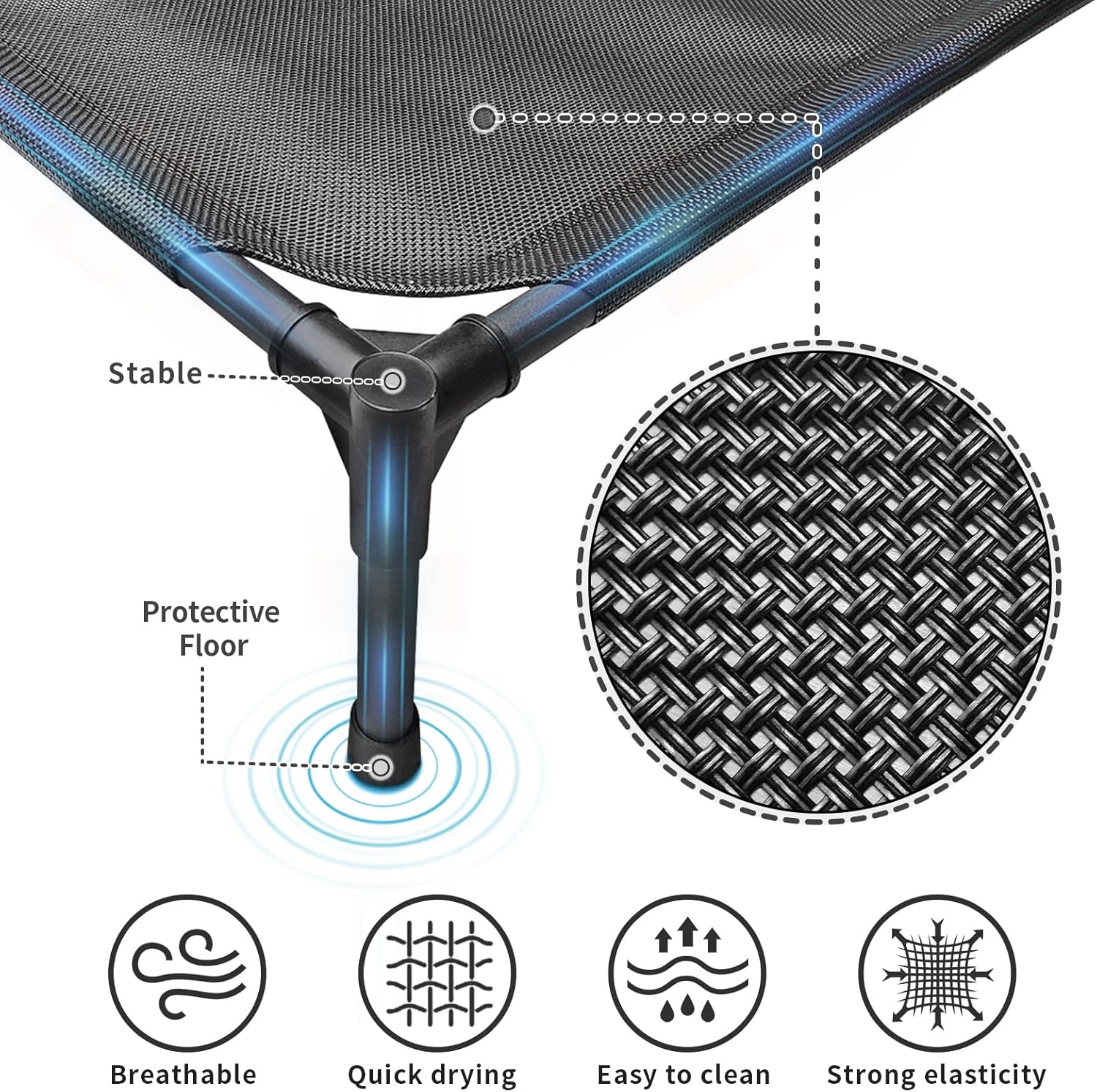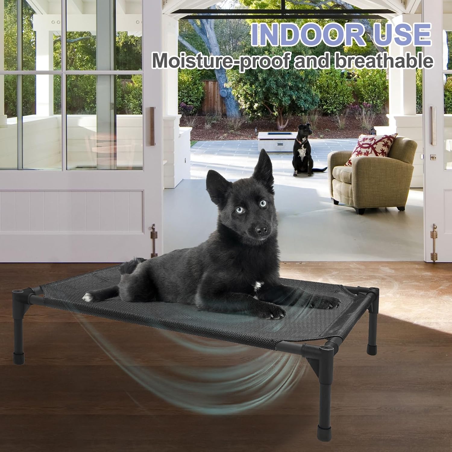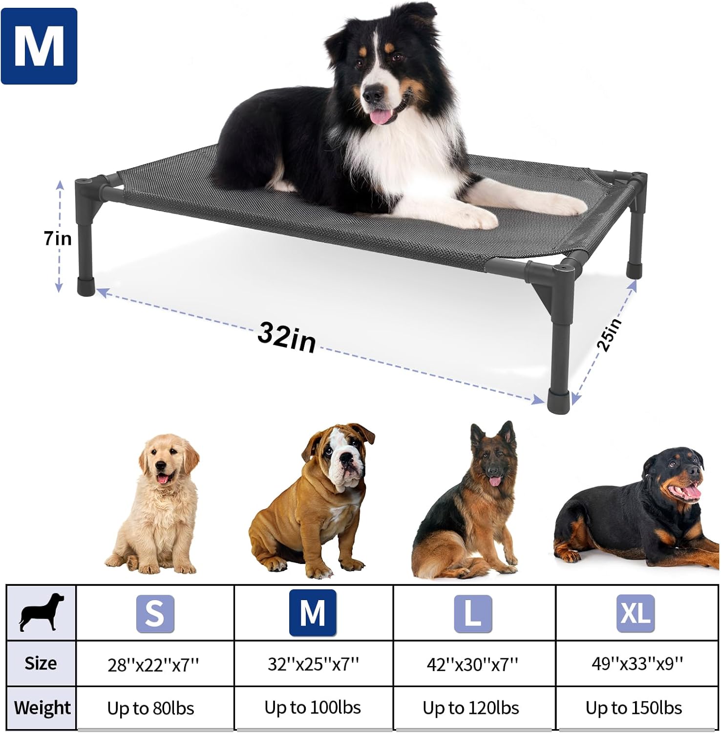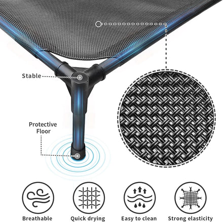 - 【Cooling Dog Cot】: This raised dog bed is made of sturdy materials and is well crafted to safely and stably lift your dog 7-9 inches off the ground. Air can circulate under the bed through woven nets, so even in hot weather, your dog can feel a breeze.Dogs are also kept away from bacteria on the ground, reducing skin diseases.