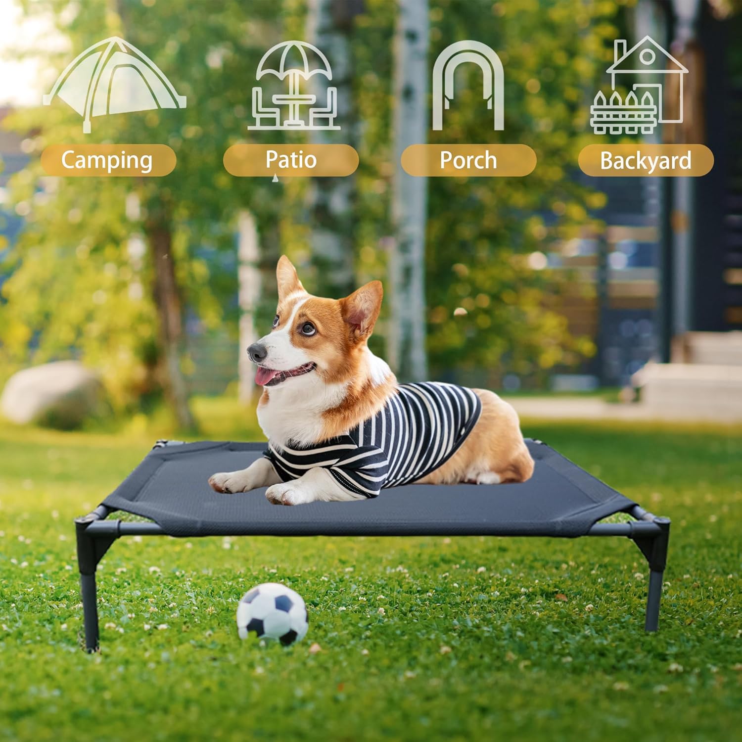 - Indoor & Outdoor Use: The Travel dog bed is ideal for the home and abroad. Suitable for both indoor and outdoor use.Lifted pet bed with breathable mesh center is great for indoor and outdoor use. Slip resistant rubber feet provide protection for indoor flooring and water resistant mesh center repels moisture and odors.Weather resistant, the 8" raised breathable mesh cot works great indoors and outside. Keep your pup dry and comfortable in the backyard, on the patio or porch, next to the pool, or while camping.