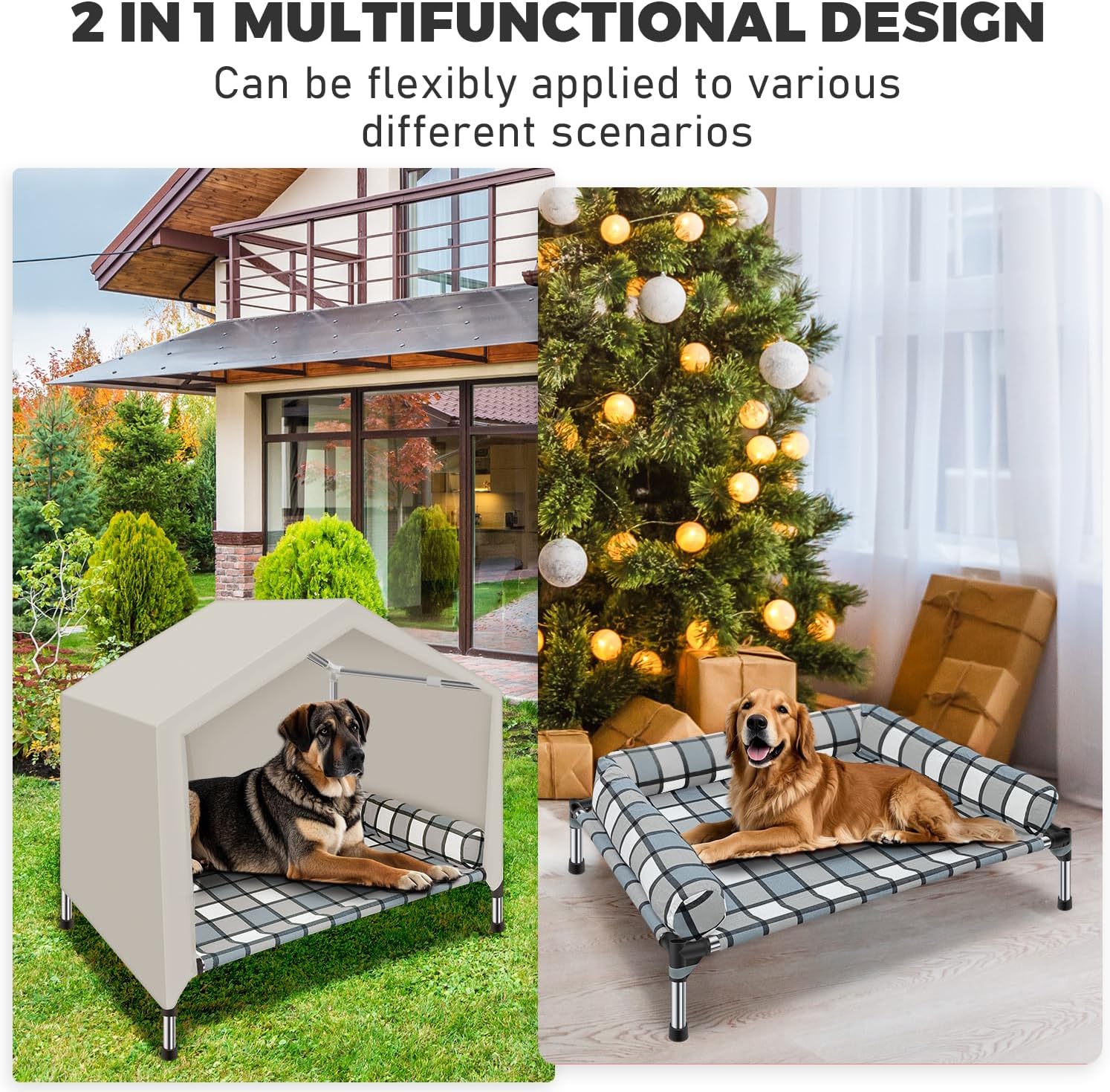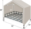 - 【2-IN-1 ELEVATED DOG HOUSE】 This dog house features a cozy pillow bed and tent cover, keeping pets off cold floors indoors and shielding them from wind, sun, and rain outdoors. Perfect for all-season comfort and security!