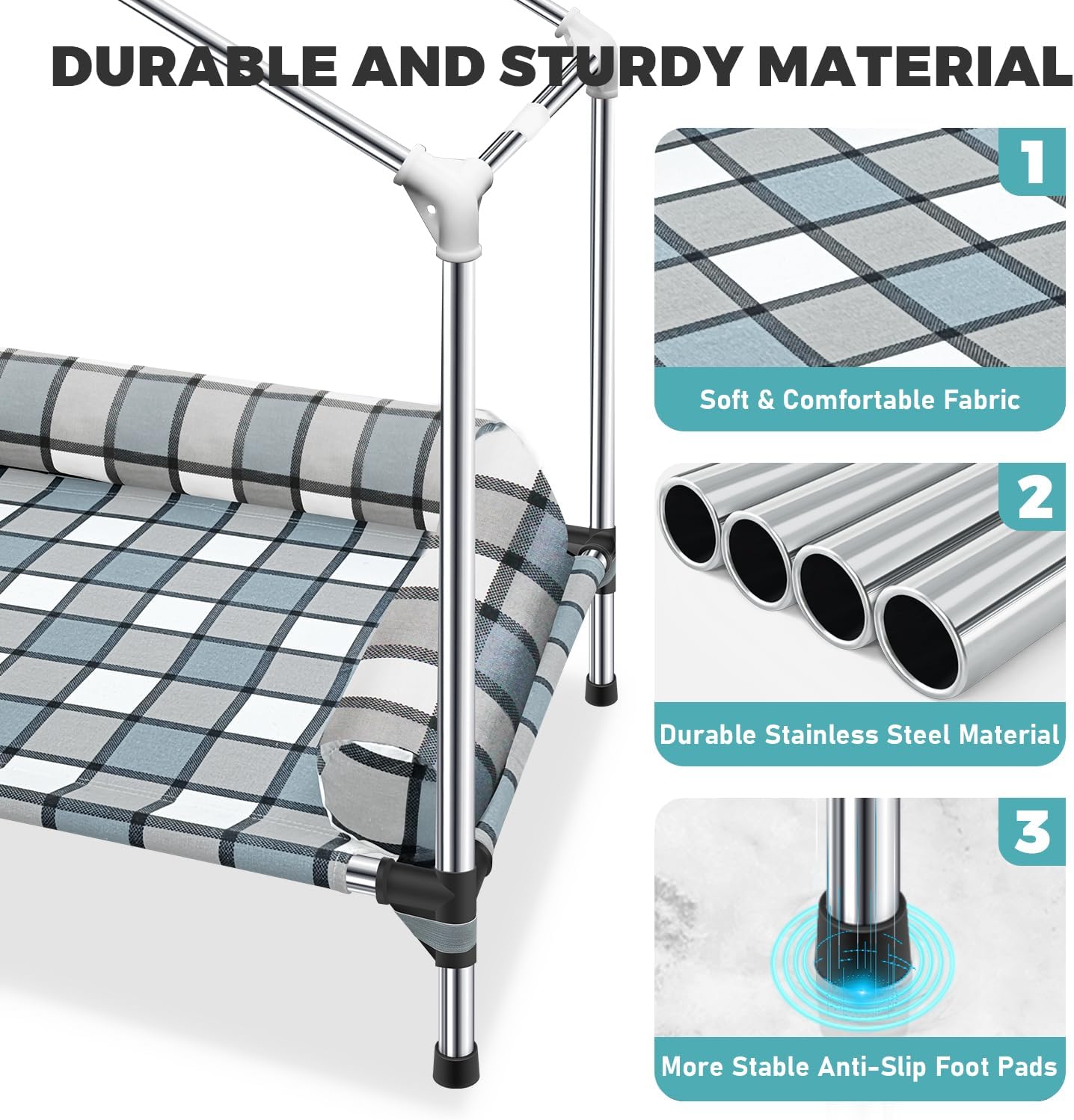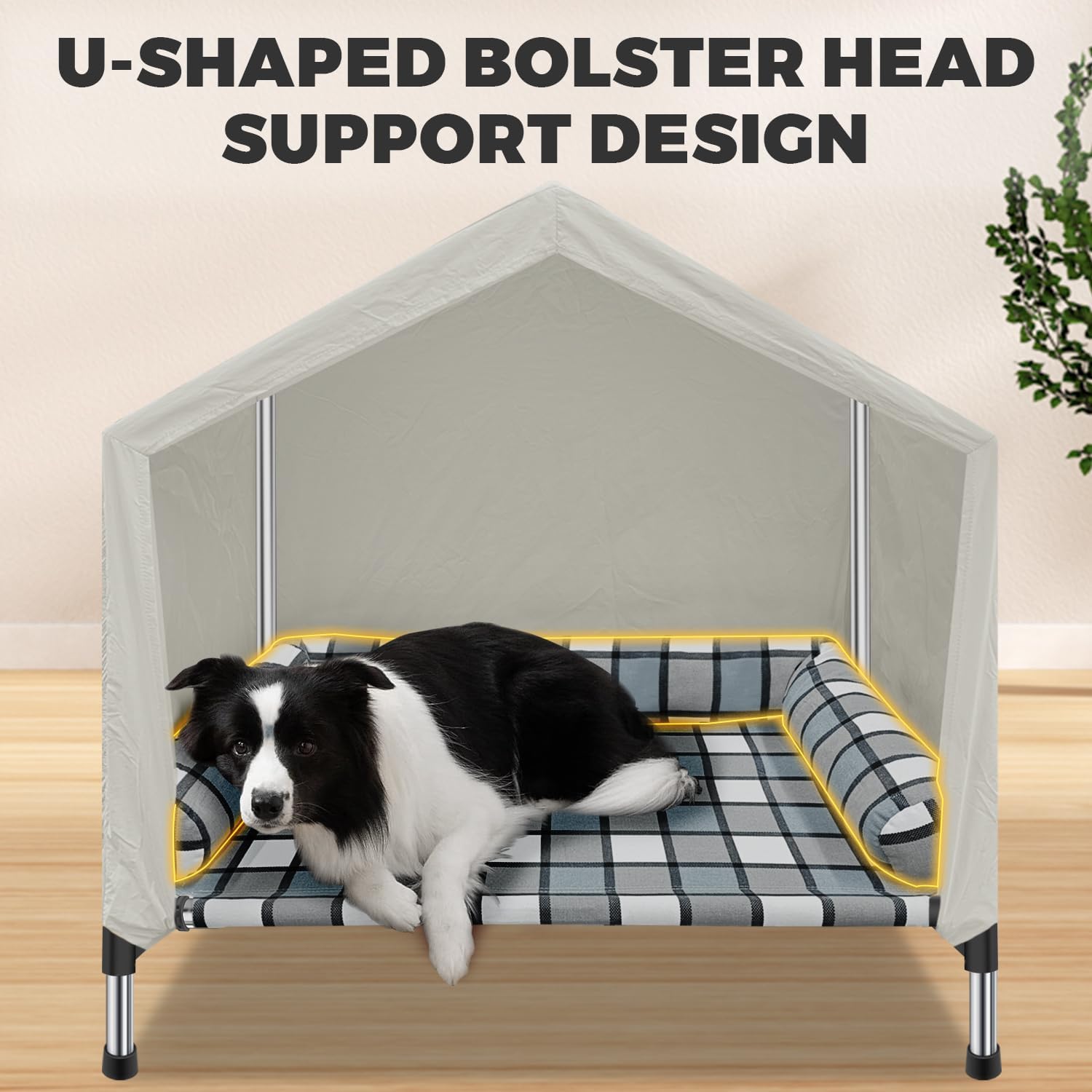 - 【COZY FABRIC & PILLOW SUPPORT】 The elevated dog bed house made with soft, skin-friendly fabric, this elevated dog bed features a u-shaped pillow for excellent head support, reducing spinal pressure and enhancing sleep quality. Designed for all dog sizes, it offers unmatched comfort for restful sleep.
