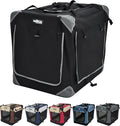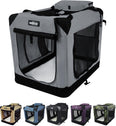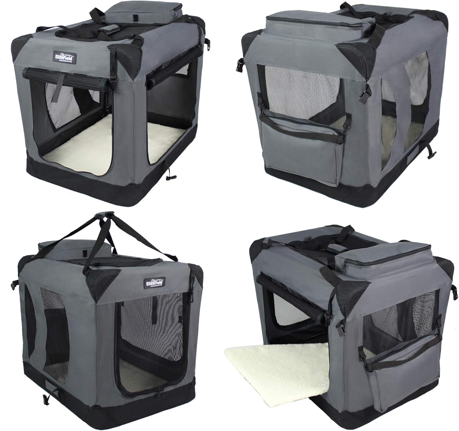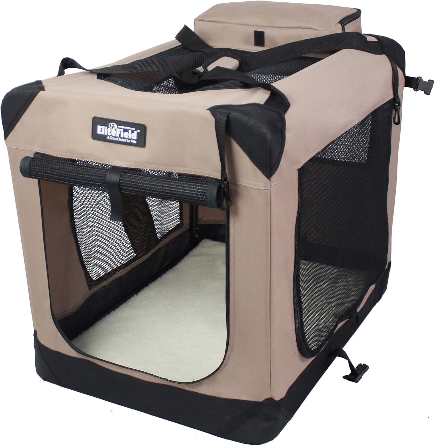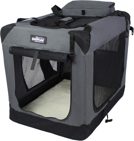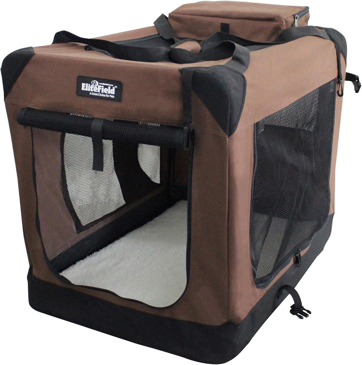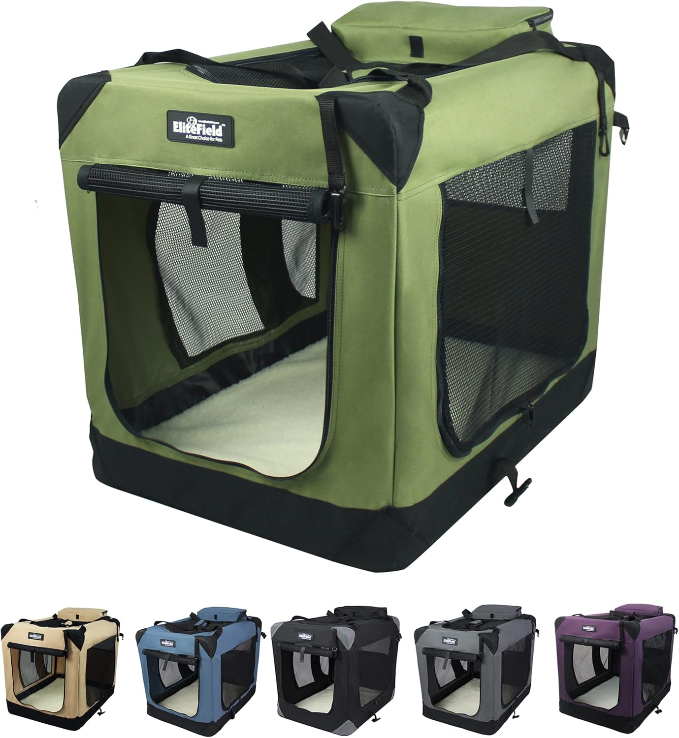The EliteField 3-door soft dog crate is a lightweight and portable pet crate designed to provide a safe and comfortable space for dogs, whether they are at home, traveling, or camping. It is constructed with high-quality materials, including a sturdy steel tubing frame and a durable, water-resistant fabric cover that can be removed and washed for easy maintenance. The crate features three mesh doors located on the top, front, and side, which provide convenient access and improved sunlight and breathability. Additionally, the front and side doors have zipper locks for safety and security. The crate also includes a removable and washable fleece bed for added comfort. In addition to its impressive features, the crate comes with a free carrying bag for easy transport and can be folded down to a height of just 3 inches, making it easy to store and transport. The EliteField soft dog crates are available in a variety of sizes and colors to suit different breeds and preferences. They are easy to set up and fold down, making them a convenient option for pet owners on the go. Backed by a 2-Year Warranty. Our products come with a quality guarantee, money-back guarantee, and customer satisfaction guarantee.