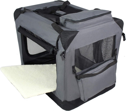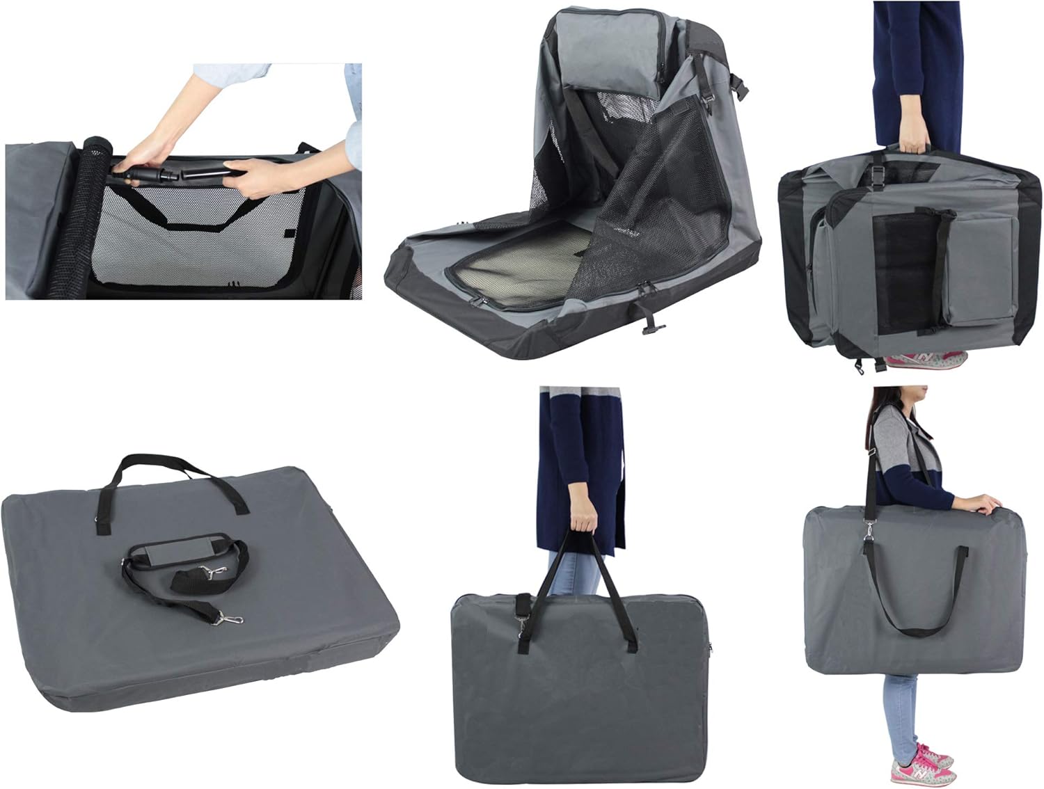 - The crate comes with a free carrying bag and fleece bed. The crate has a handle and hand carrying straps, while the carrying bag features both hand carrying straps and an adjustable padded shoulder strap, providing many carrying options. The crate can be folded down to a height of just 3 inches, making it easy to transport and store