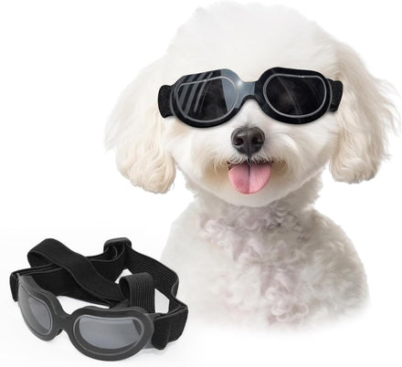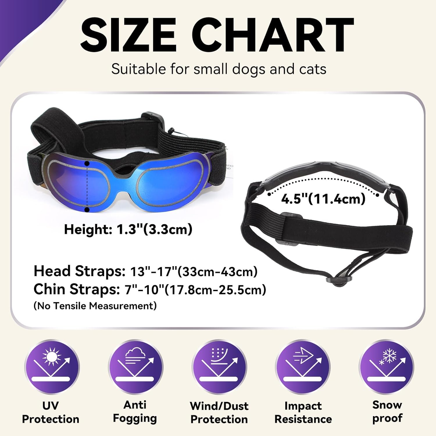 Tamaño: Altura 1.4 pulgadas, longitud 4.72 pulgadas. Correa elástica ≤ 14 pulgadas, correa de mandíbula elástica ≤ 8.2 pulgadas, correas elásticas ajustables, adecuadas para perros pequeños, gatos, conejos, etc. El forro de espuma hace que los ojos del perrito sean más cómodos. Protección UV, resistente al viento, impermeable, a prueba de desechos. No solo la mejor protección para los ojos, sino también el vestido fresco.