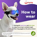 - Cuando pones los lentes de sol por primera vez en tu perro, tal vez siga tratando de sacudirlos, necesitas llevar a tu cachorro fuera en la luz brillante o lugar de riego y luego ponerlos de nuevo, es como si estuviera haciendo clic en él/ella, se dio cuenta de que estos lo estaban ayudando, y él o ella los usará bastante contentos.