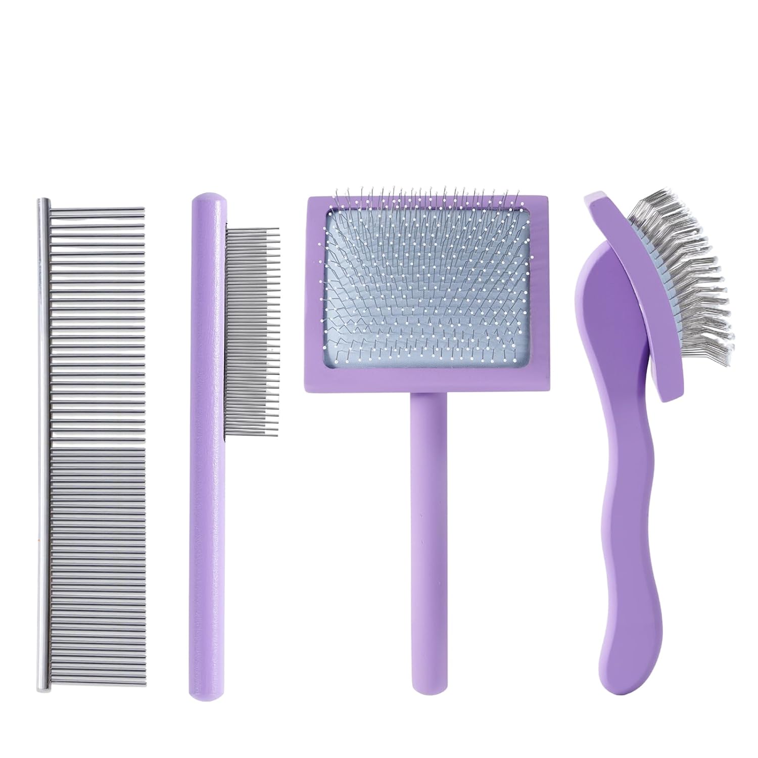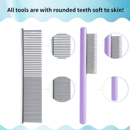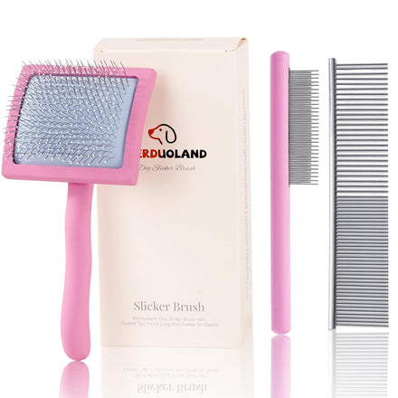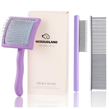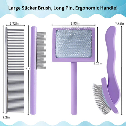 - DOG SLICKER BRUSHES FOR GROOMING:You will receive 1 PCS dog slicker brush with long, denser, and softer pins, 1 PCS Wide and narrow teeth comb for loose hair, dander & dirt trapped beneath fur, 1 PCS 2-IN-1 detangling handle comb designed with long and short metal teeth groom top coat and undercoat at one time.