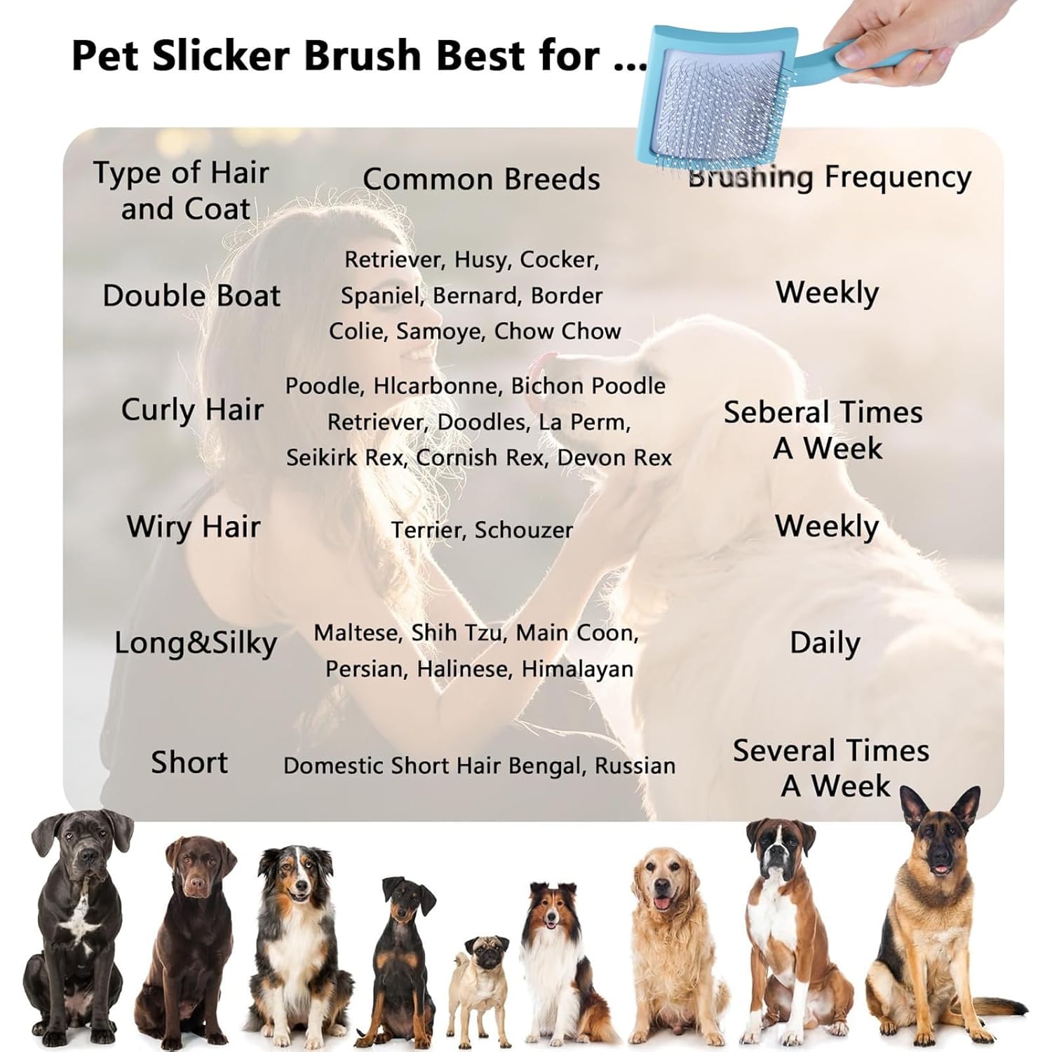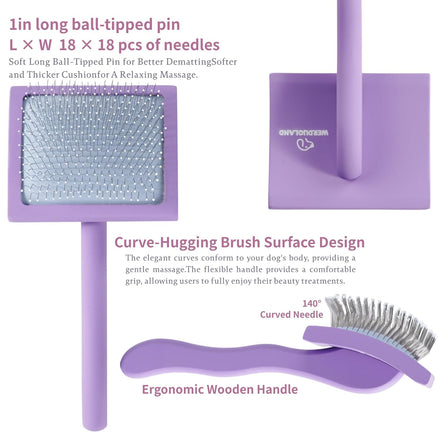 - PROFESSIONAL GROOMING DOG SLICKER BRUSH:Werduoland Pet brush for dogs large contact surface Increase the area of contact with pet hair during grooming. 140°curved surface conform to grooming habits save time and energy. Werduoland Pet Curved Slicker Brush has unique design longer, denser and softer stainless steel pins penetrate deep into the coat with 25mm total 270+ needles.This multi-purpose flicker brush perfect for loosing undercoat hair long,straight,curly,thick,shaggy.