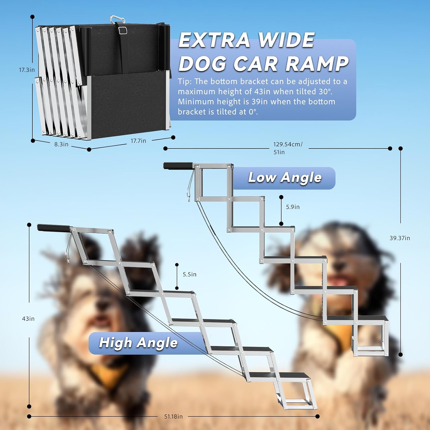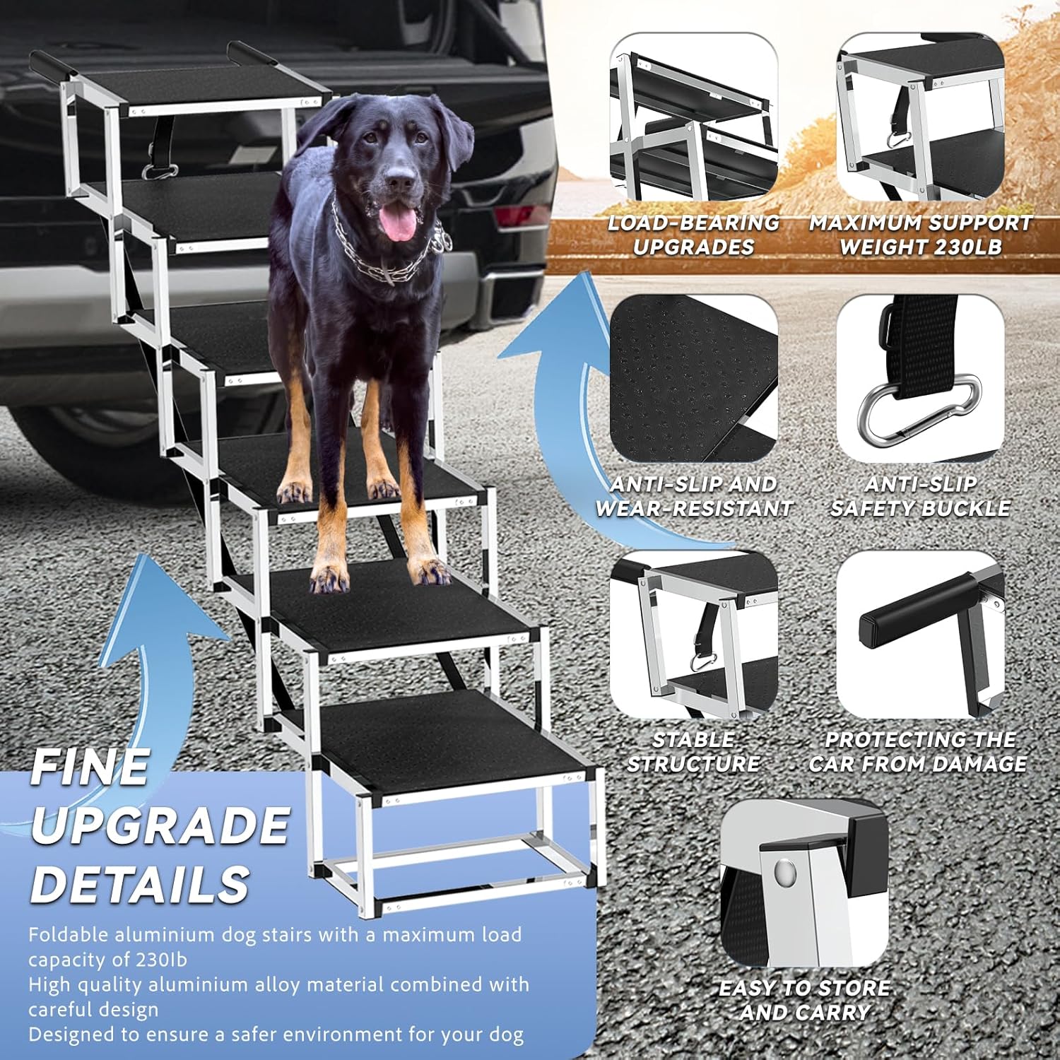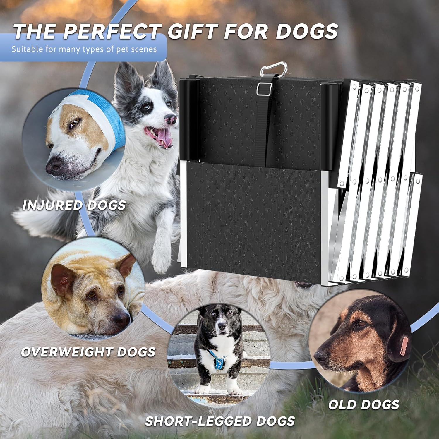 - Rampa para perros de diseño superior de 43 pulgadas para automóvil: nuestras escaleras para perros grandes cuentan con una escalera extra ancha y estable, reduciendo la presión sobre las piernas de tu amigo peludo. Hemos incorporado comentarios del mercado y mejorado las escaleras para perros a 6 escalones con una altura de 43 pulgadas. Diseñadas para ser más suaves en las articulaciones y evitar lesiones, estas escaleras son ideales para perros de patas cortas, ancianos, discapacitados o lesionados.