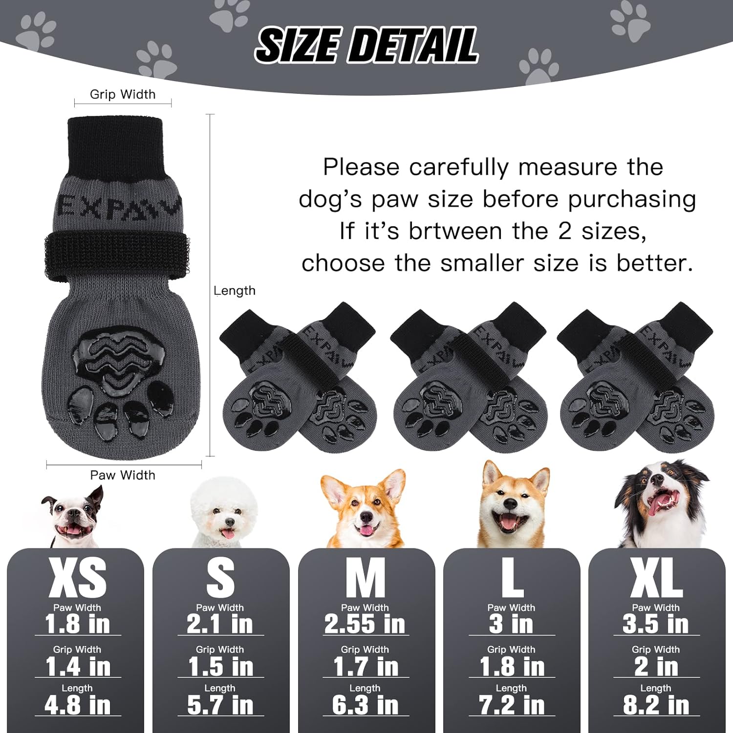 Size Information: This dog sock is available in 5 sizes. Please measure your dog's paw size before purchasing. Because our pet paw protector socks are made of elastic fabric, if the dog's paw size is between two sizes, it will be more comfortable to choose a smaller size for your dog.